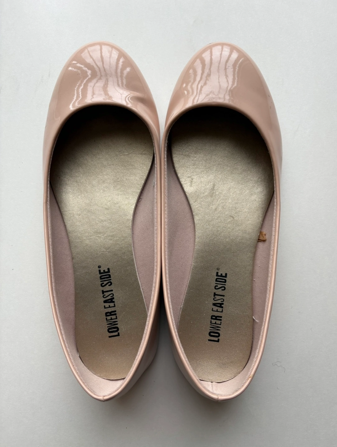 Pair of nude patent leather ballerina flats. Lightly worn. Size 7W.