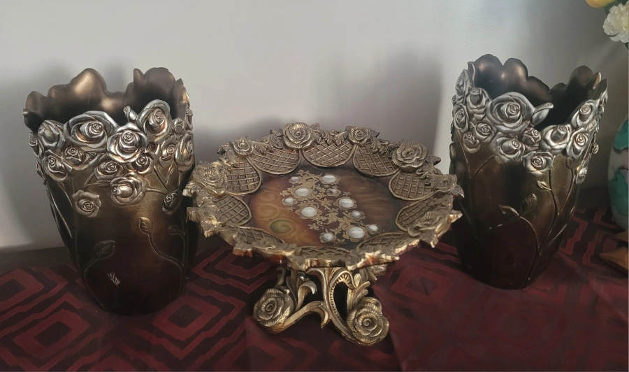 Elegant decorative set. Features two ornate vases and a decorative tray. Rose accents. Gold and brown tones. Perfect for a centrepiece or mantle.