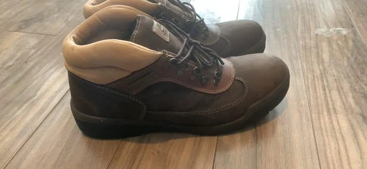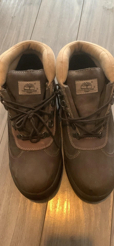 Pair of brown leather Timberland boots. Classic style. Great for everyday wear or hiking. Pre-owned, good condition. Please see photos for details.