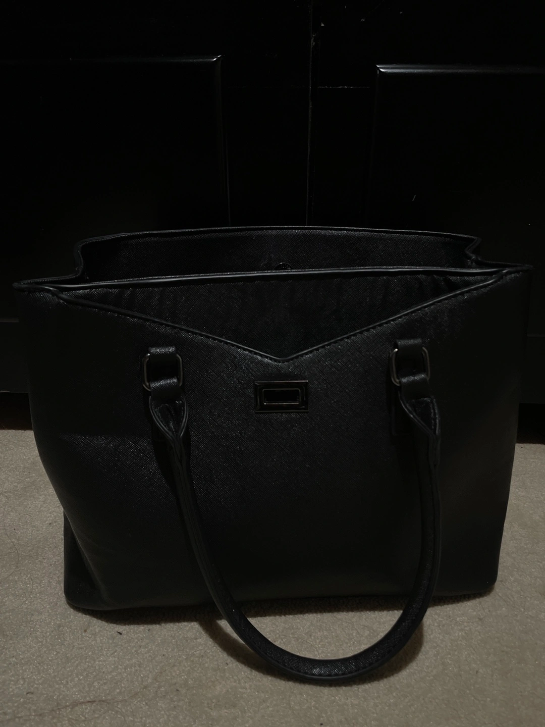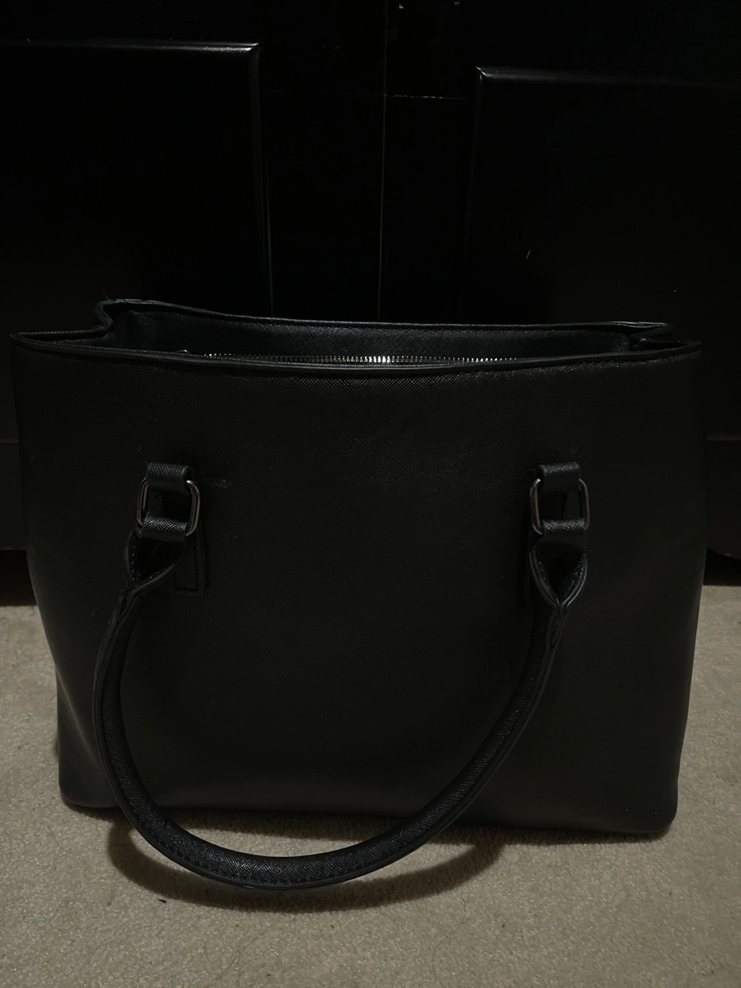81Stylish black purse. Features a zipper closure and two top handles. Inside pockets for organization. Great for everyday use.