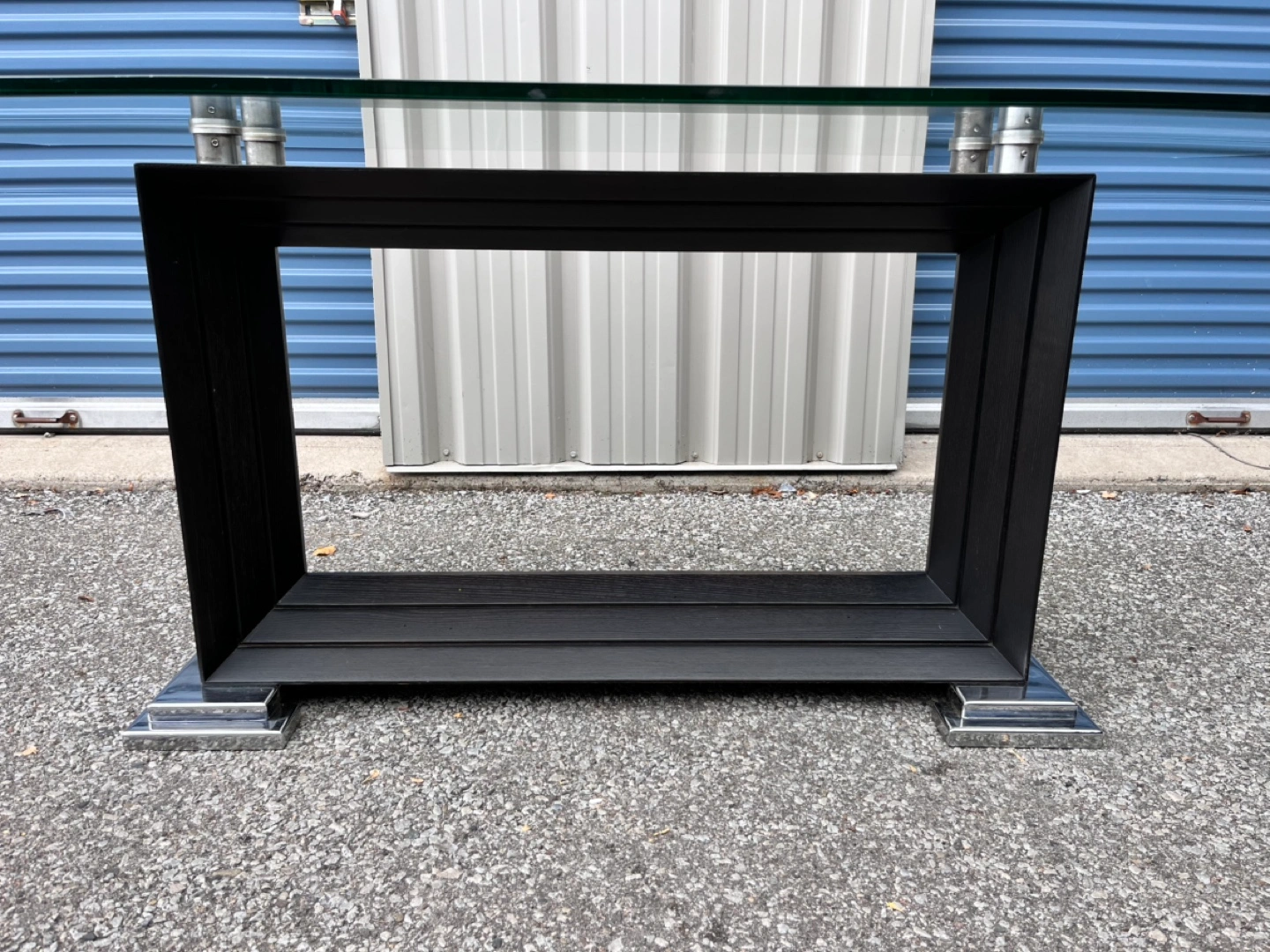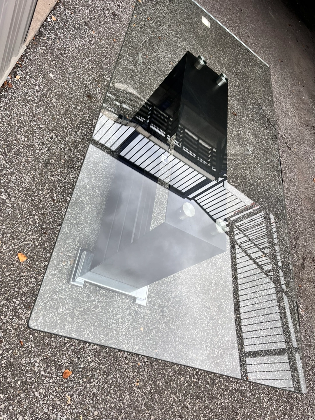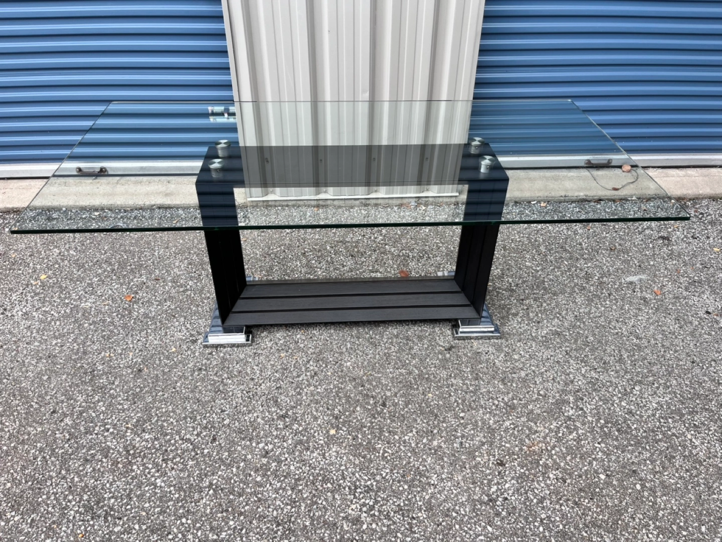 Stylish dining table. Features a clear glass top and a sleek black frame with chrome accents. Unique design, perfect for a contemporary living room. Durable and easy to clean.