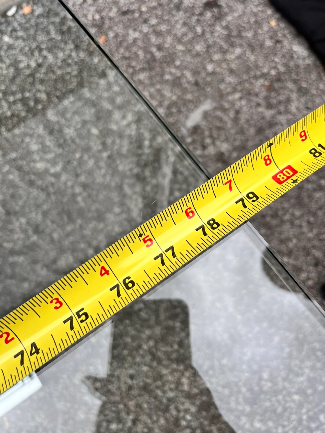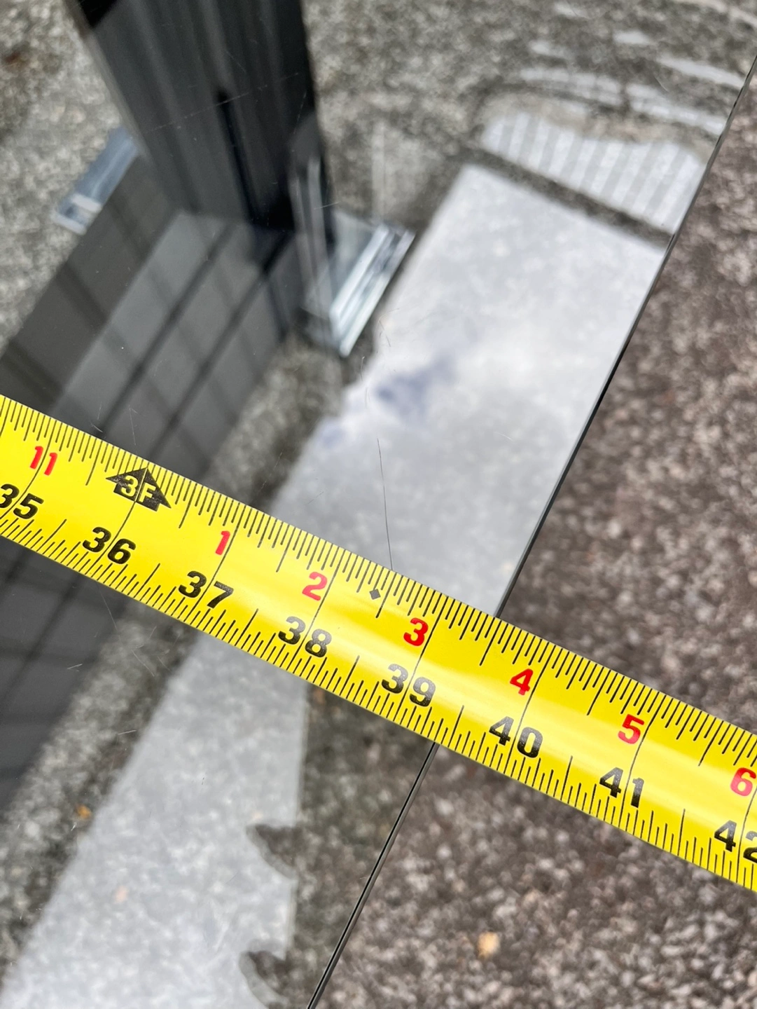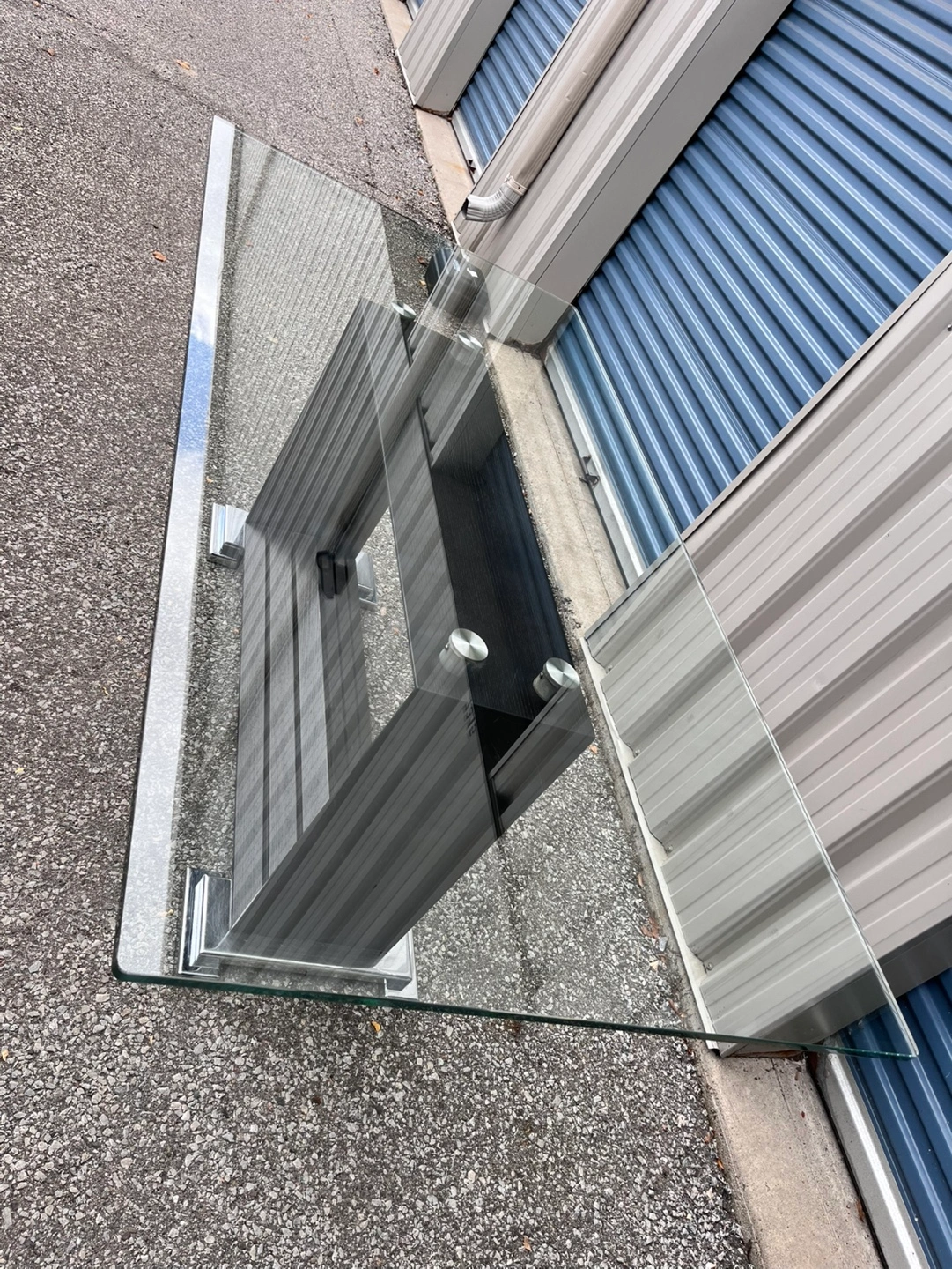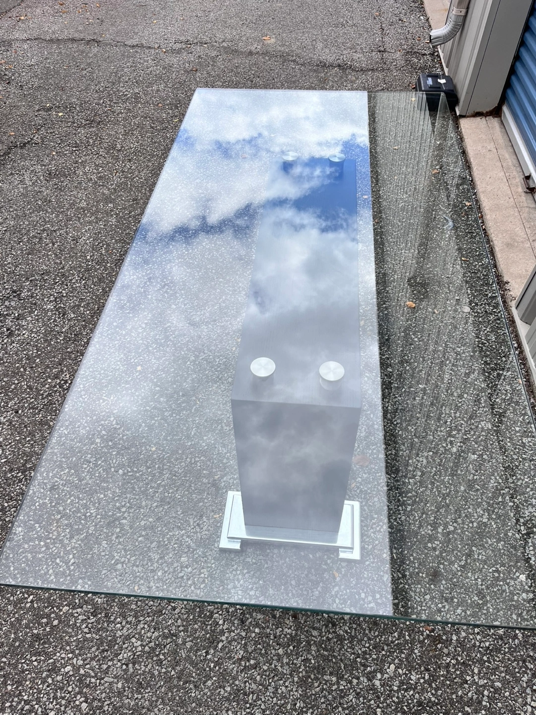 Stylish dining table. Features a clear glass top and a sleek black frame with chrome accents. Unique design, perfect for a contemporary living room. Durable and easy to clean.