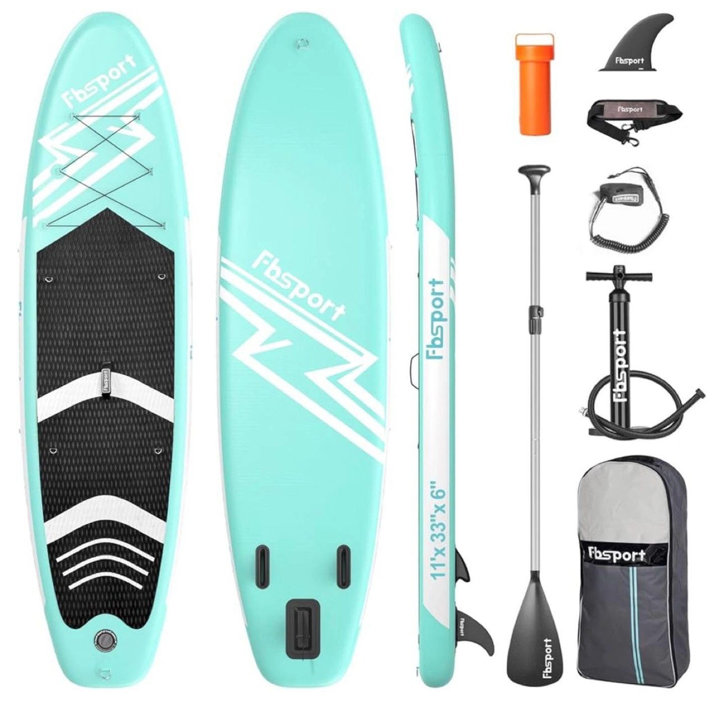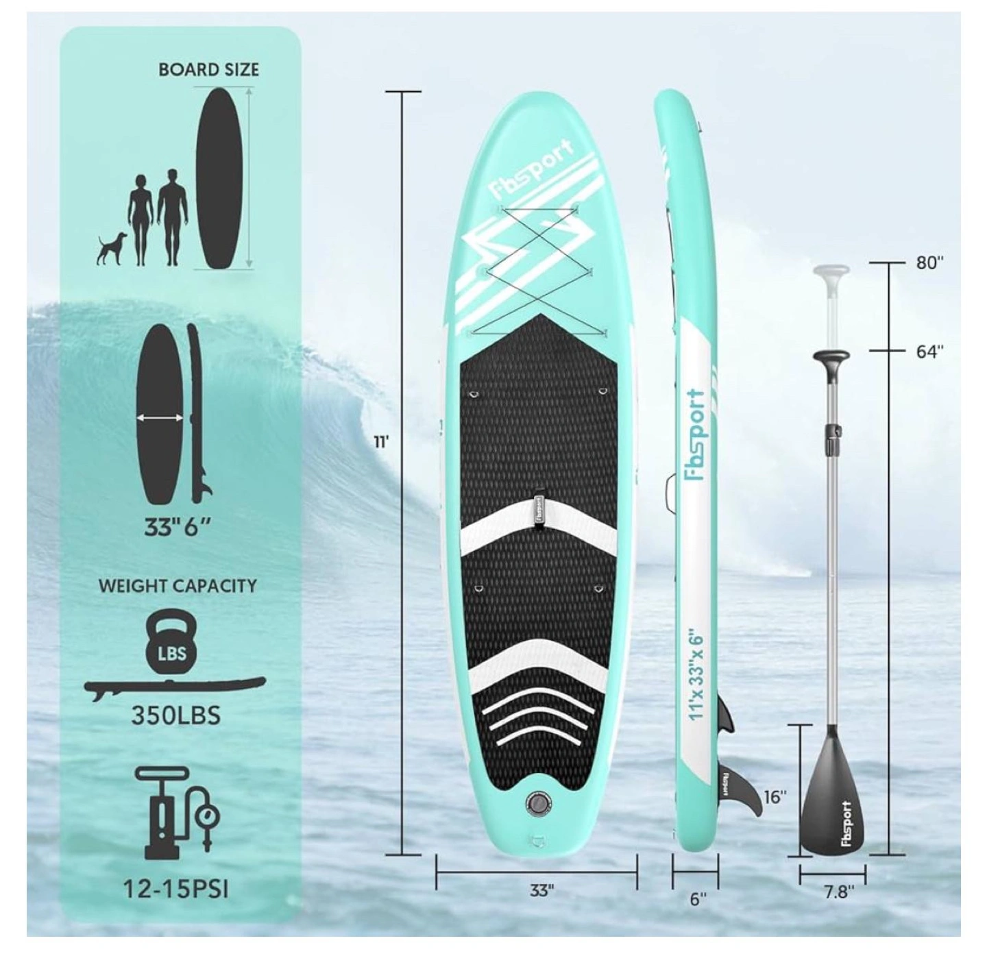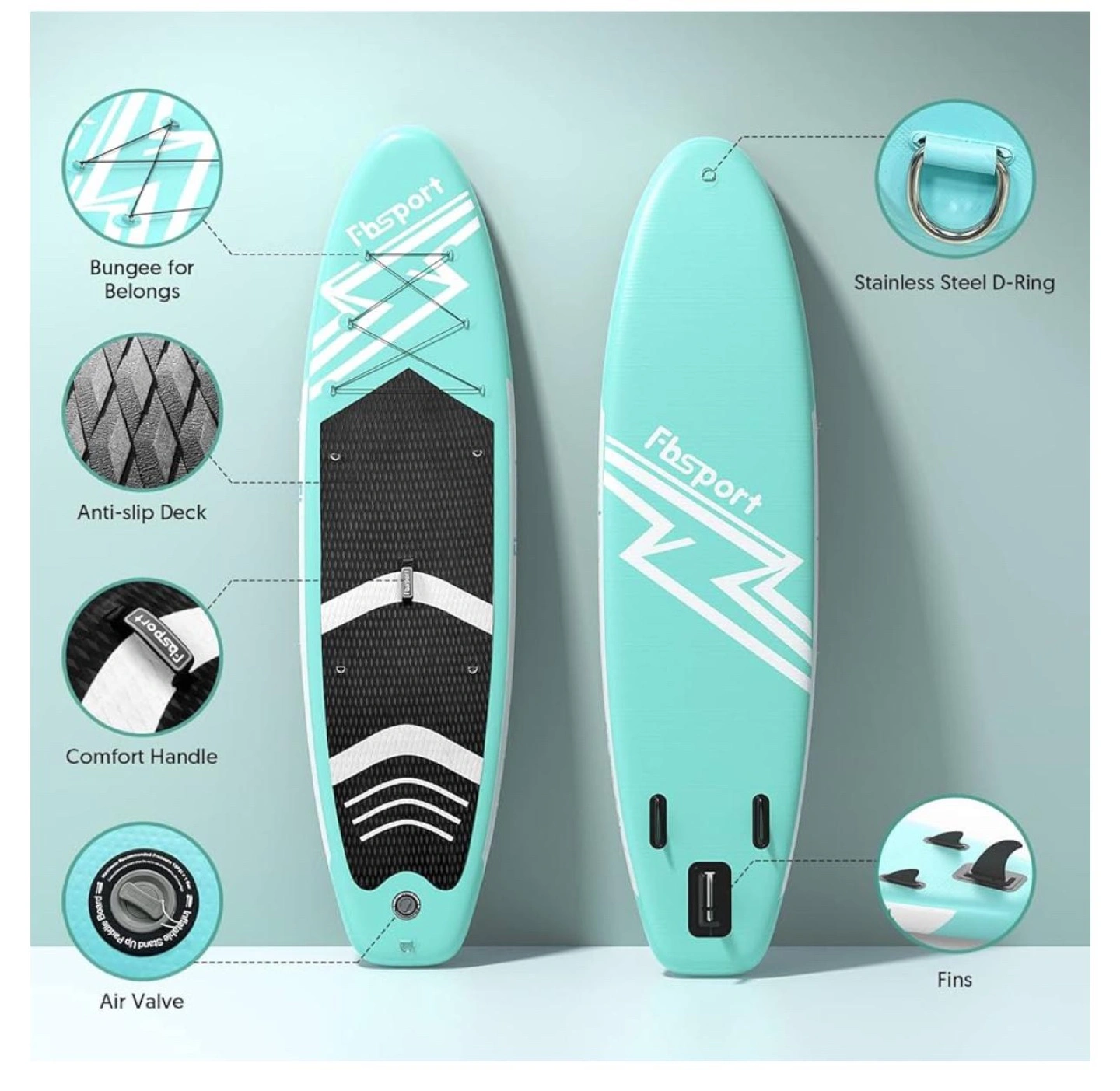 Inflatable stand up paddleboard, aqua colour. Includes paddle, pump, fin, leash, and carrying bag. Durable construction, anti-slip deck. Features bungee cords, D-rings, and comfort handle. Maximum weight capacity 350 lbs.