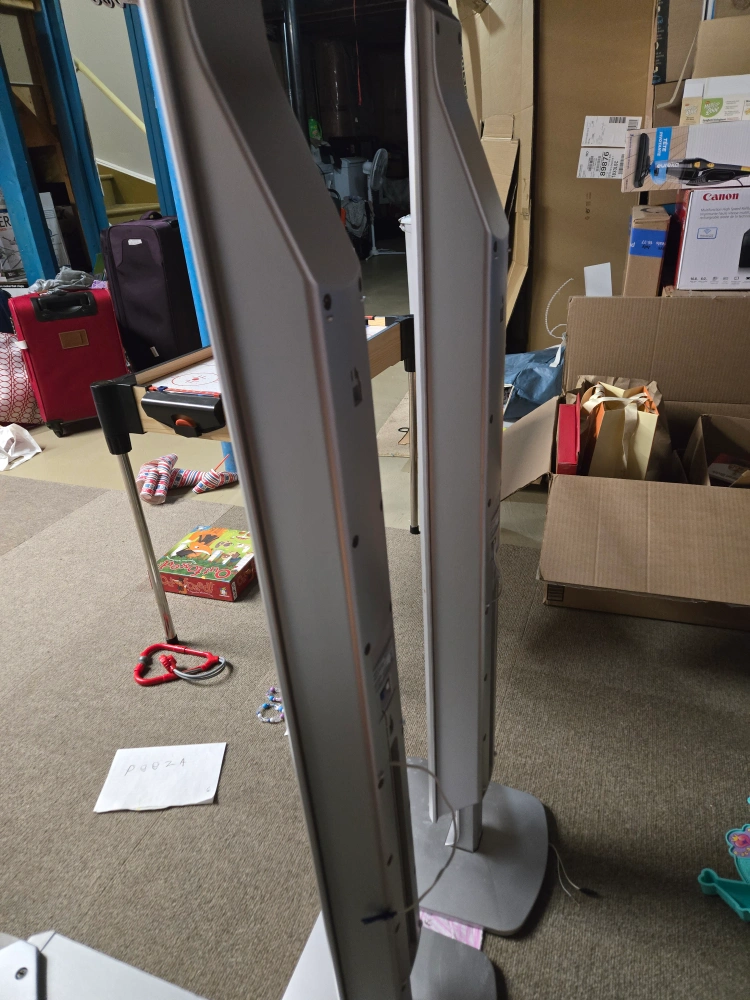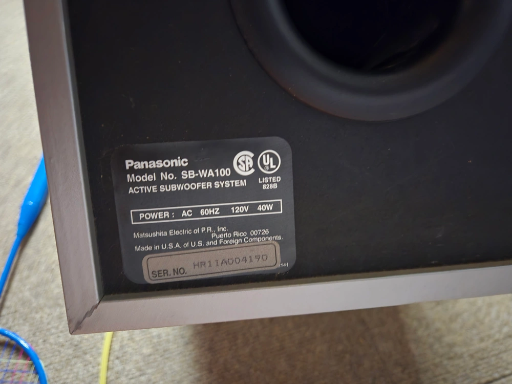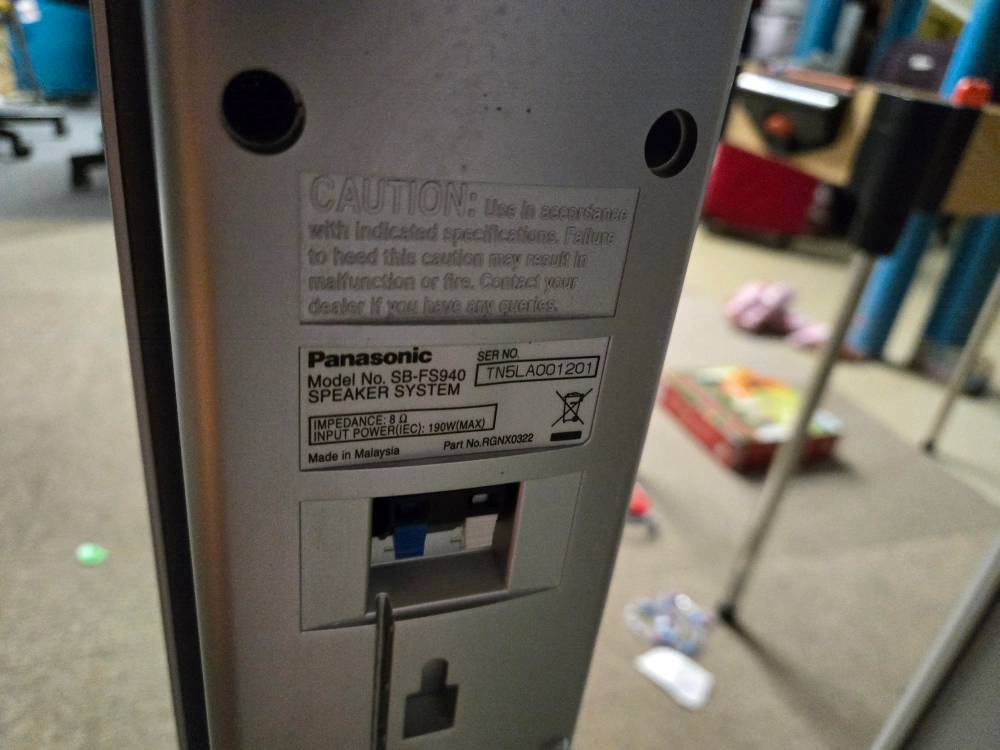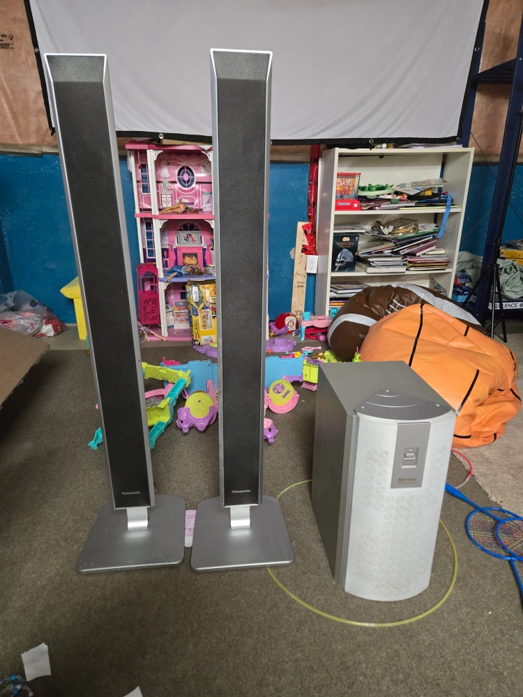 Panasonic home theatre system. Includes subwoofer and two tall speakers. Silver finish. Subwoofer model number SB-WA100. Speaker model number SB-FS940. Good condition. Got it from a neighbour who told they work. Haven't tried them. If they don't work you can return them and get money back.