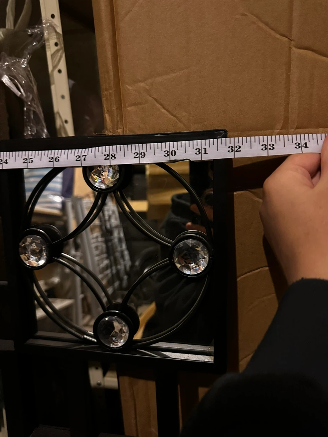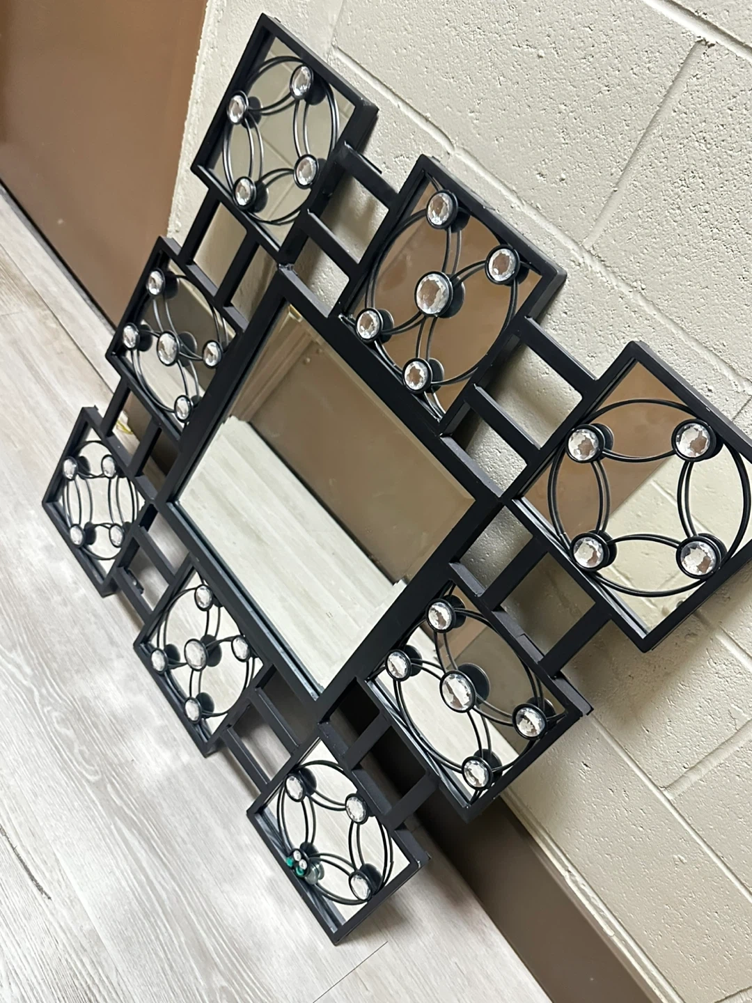 Black metal frame decorative mirror with clear crystal accents. This piece measures approximately 32x32 It's a stylish addition to any room!
