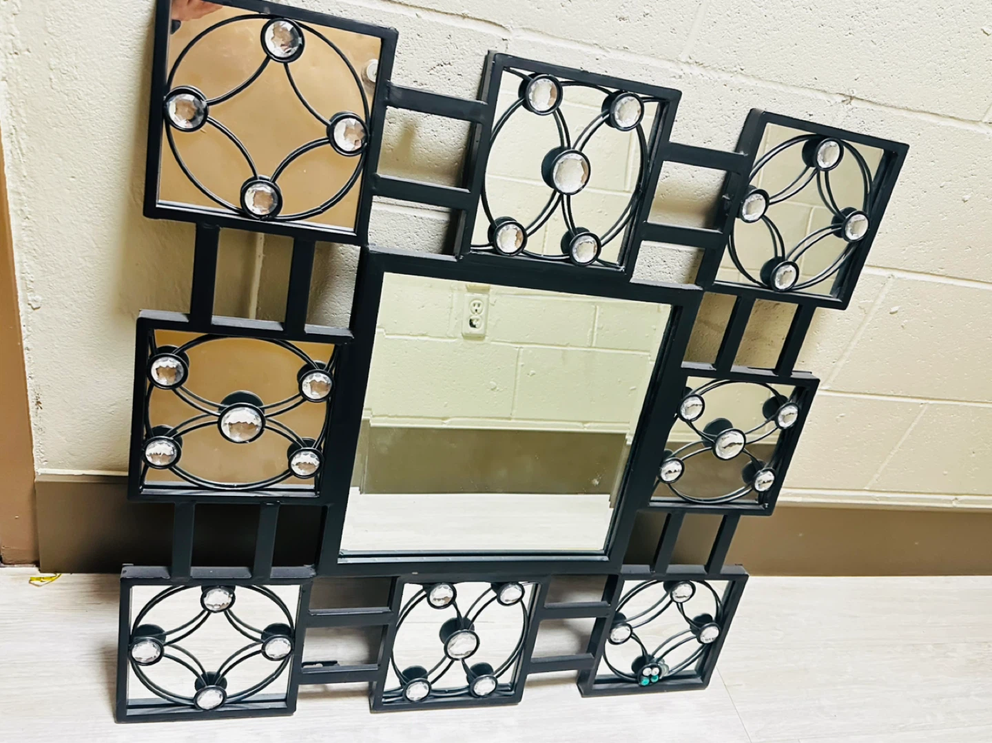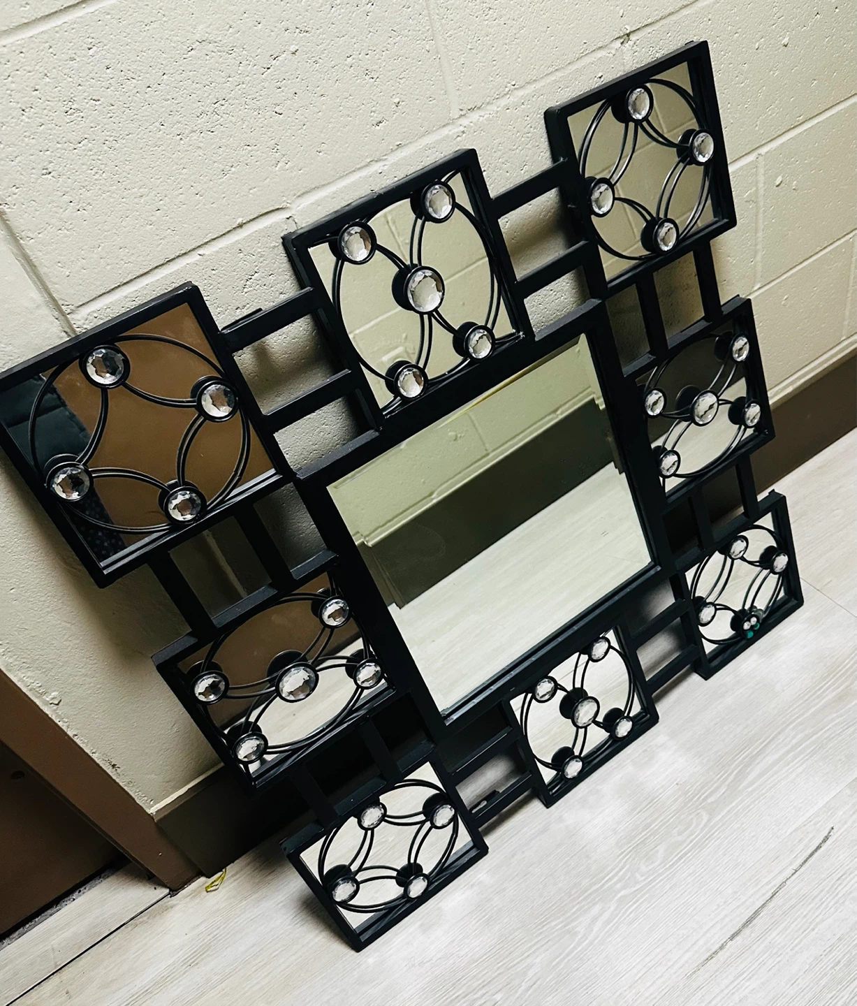 Black metal frame decorative mirror with clear crystal accents. This piece measures approximately 32x32 It's a stylish addition to any room!