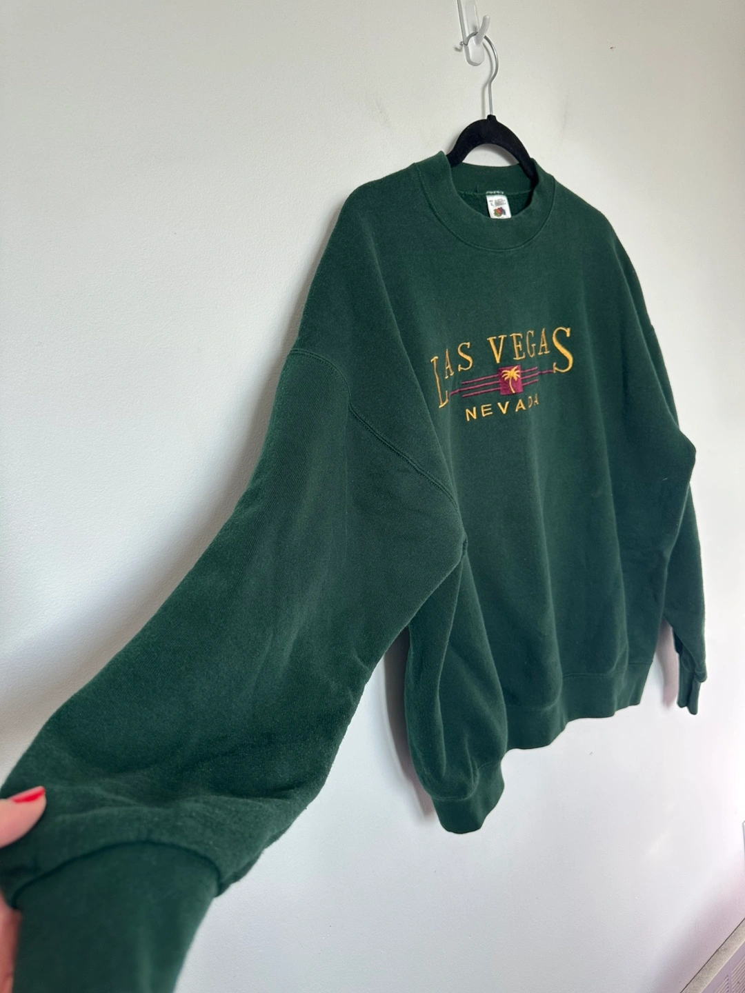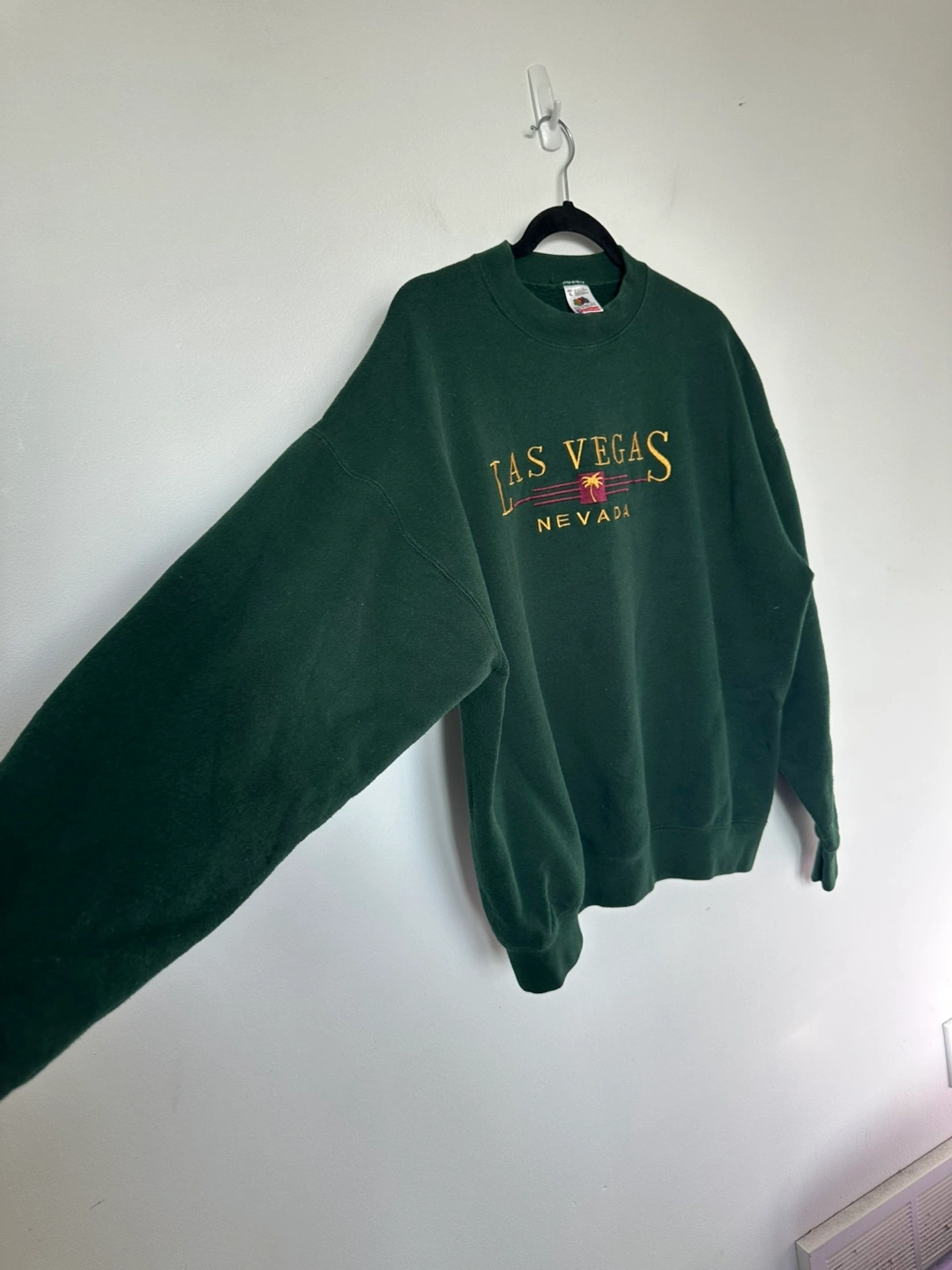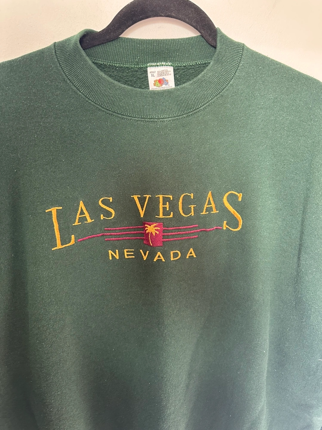 Dark green crewneck sweatshirt. Features embroidered Las Vegas, Nevada graphic. Size XL. Made in the USA.