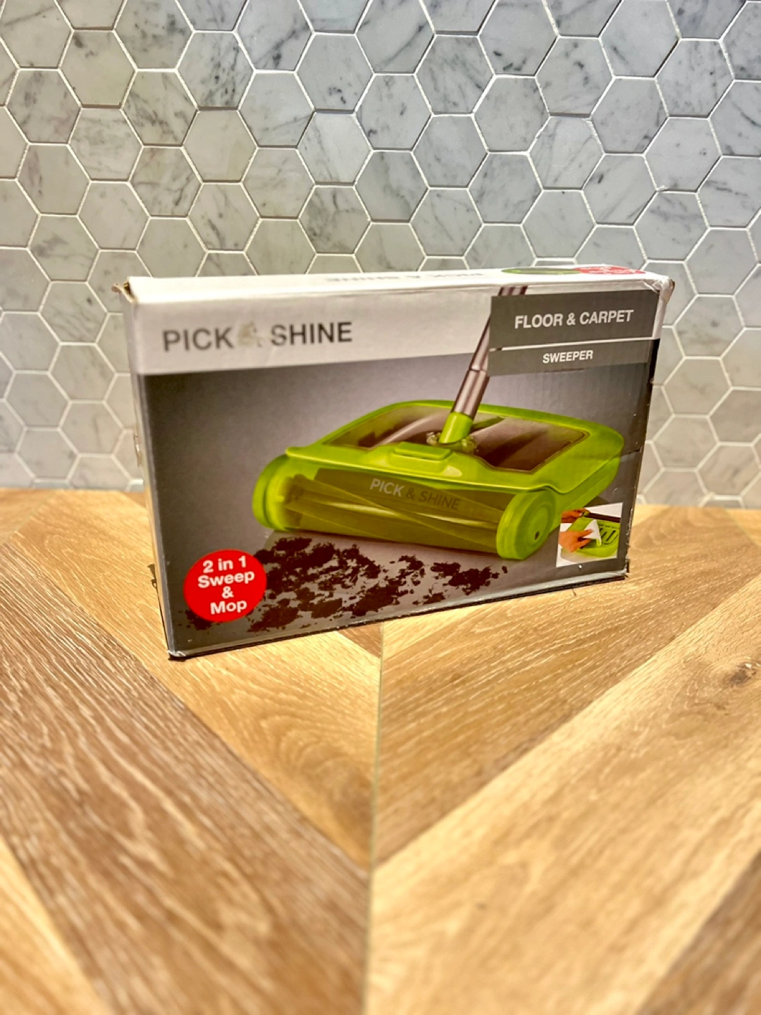 75New in box. Floor and carpet sweeper. Two-in-one design. Sweeps and mops. Rotating fins. Easy-empty container. Use on most smooth floors.