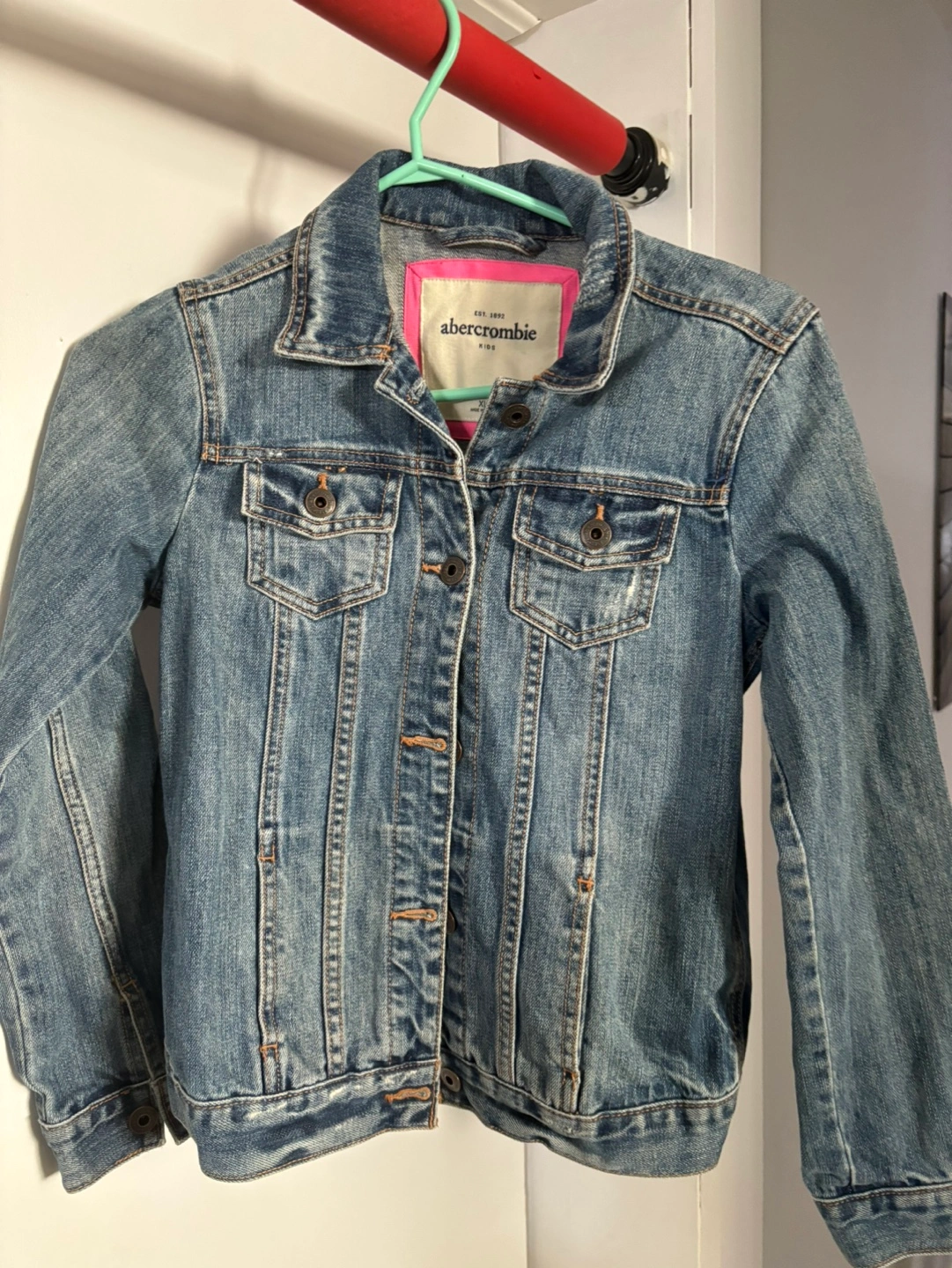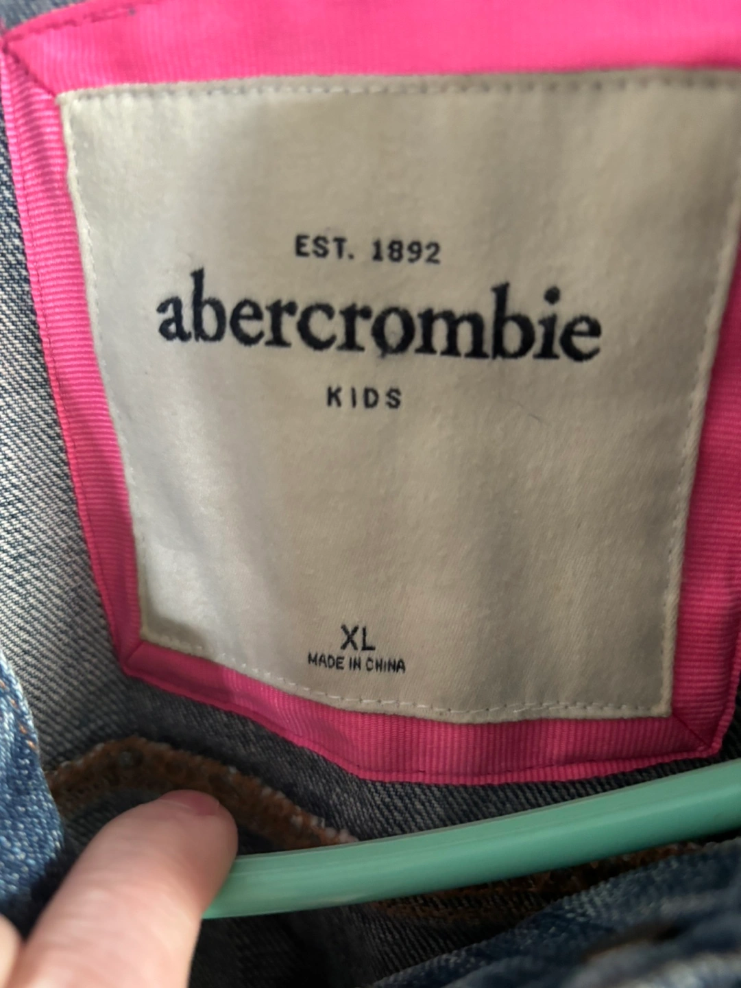 Girls' Abercrombie Kids denim jacket. Size XL. Light wash. Long sleeves. Button closure. Two front pockets. Made in China.