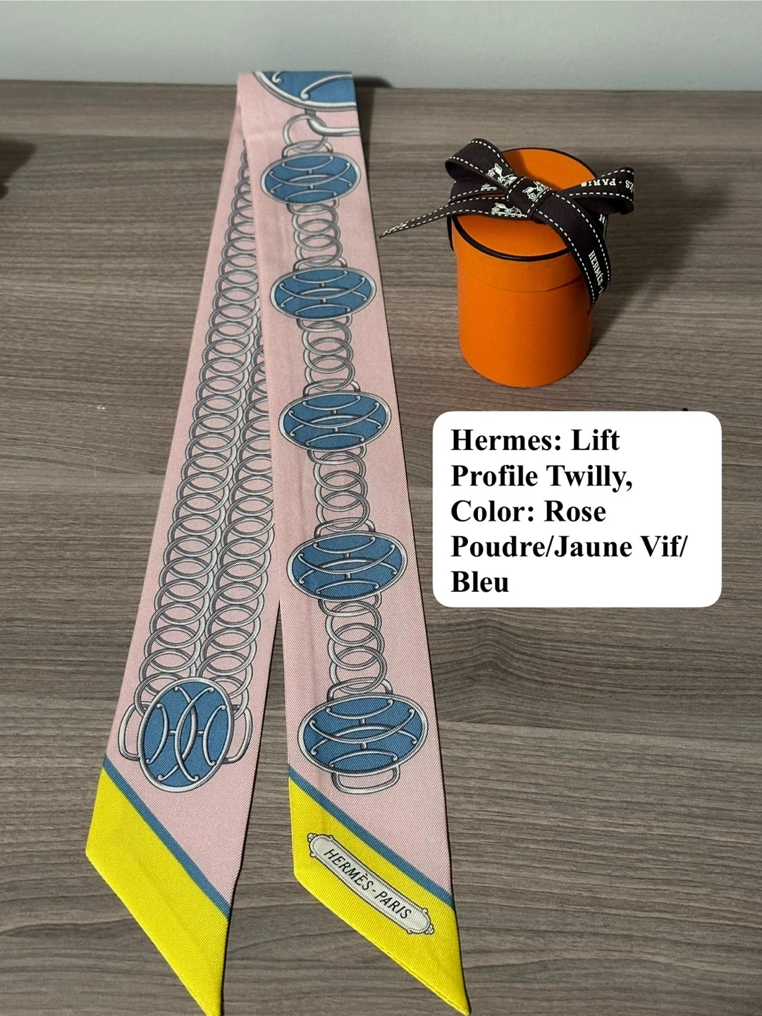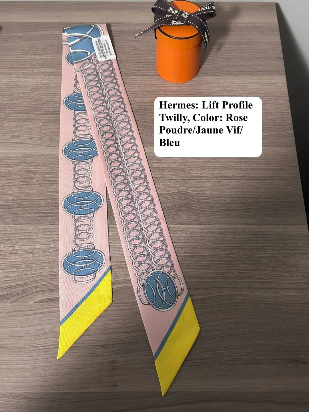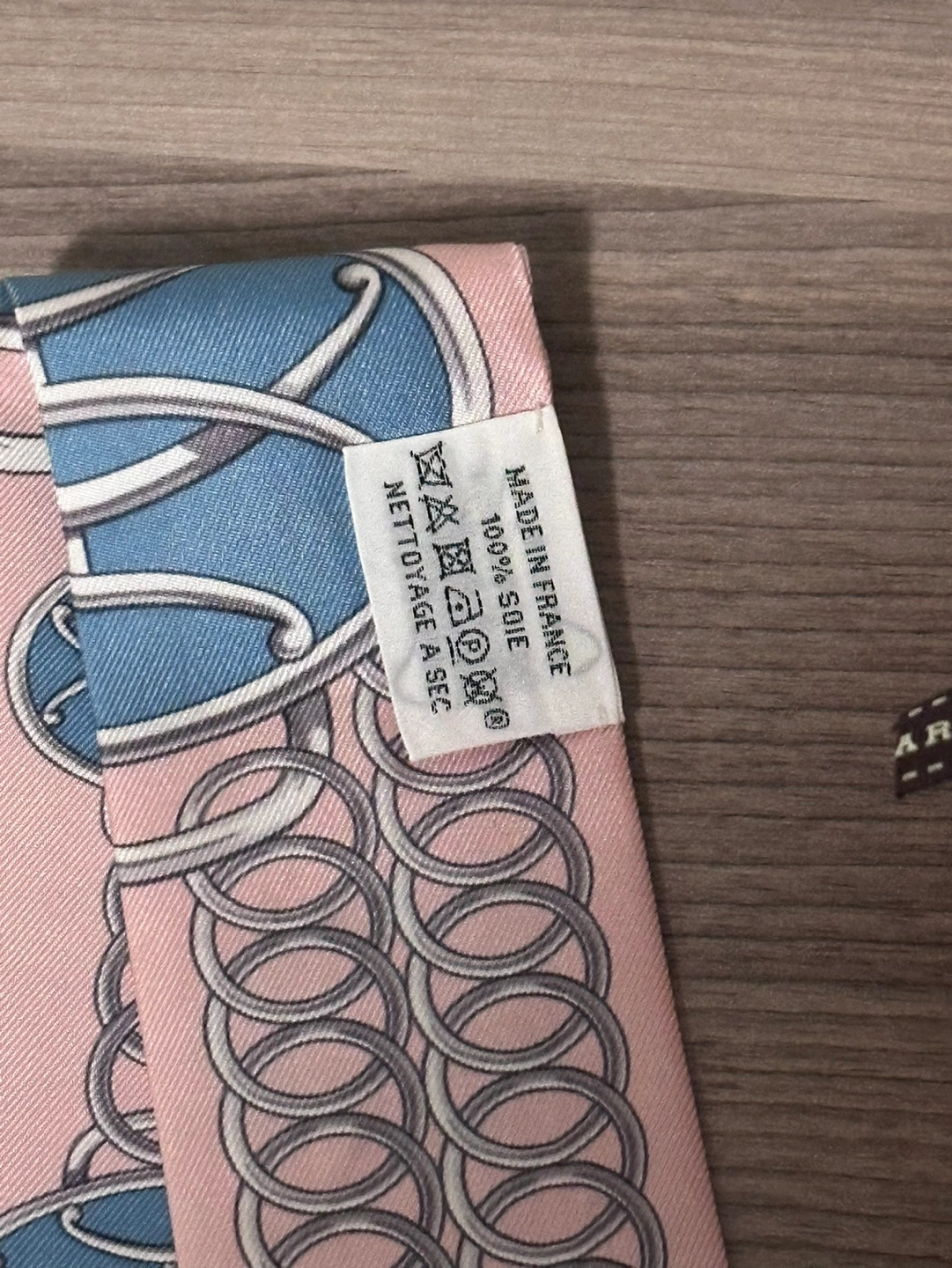 727Beautiful Hermes 100% silk twilly. Pink, yellow, and blue design. Comes with original box and paper bag. Made in France.