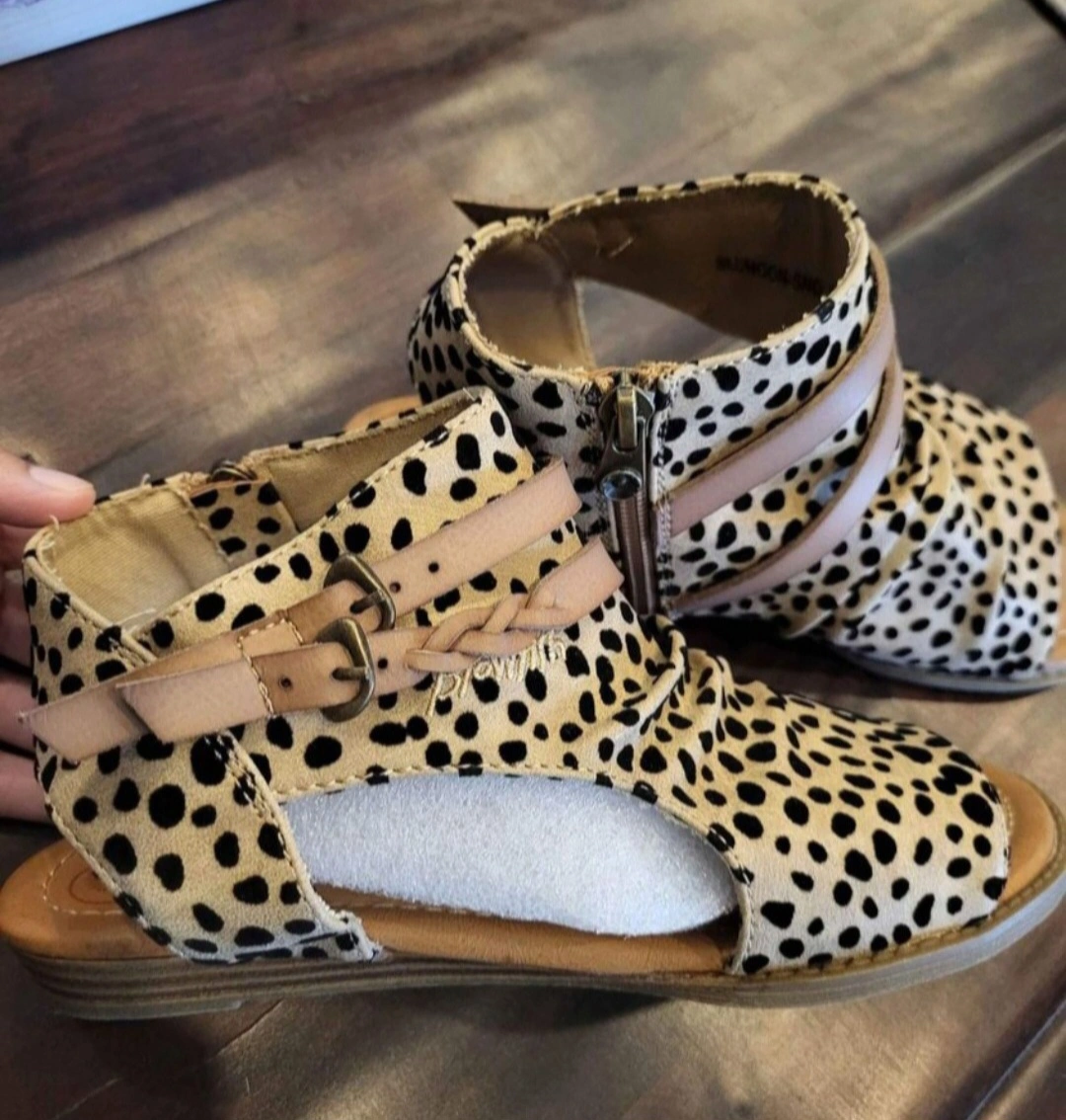 Cute women's sandals. Dalmatian print fabric upper. Tan leather straps and buckles. Side zipper closure. Open toe and heel. Low wedge heel. Brand new, size 6. $25.