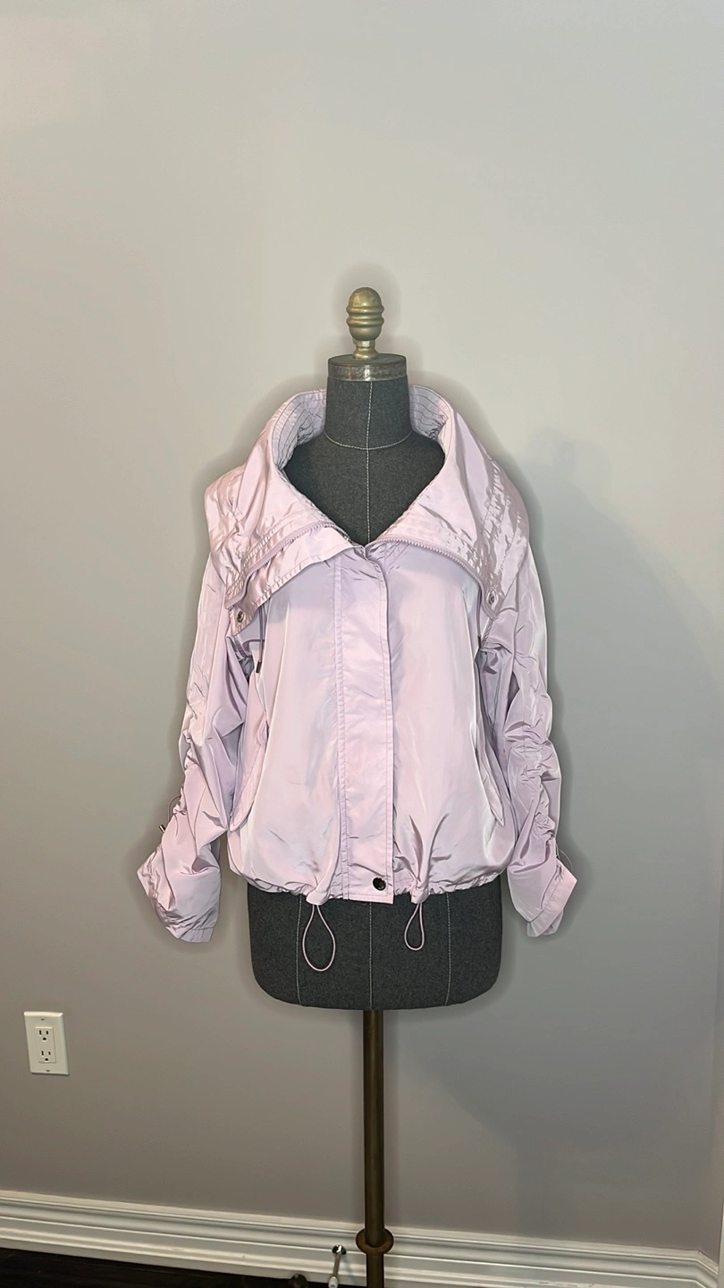 Lightweight jacket, lavender colour. Features a high collar, long sleeves with cinched cuffs, and a drawstring hem. Front zipper closure. Small front pocket. New without tags