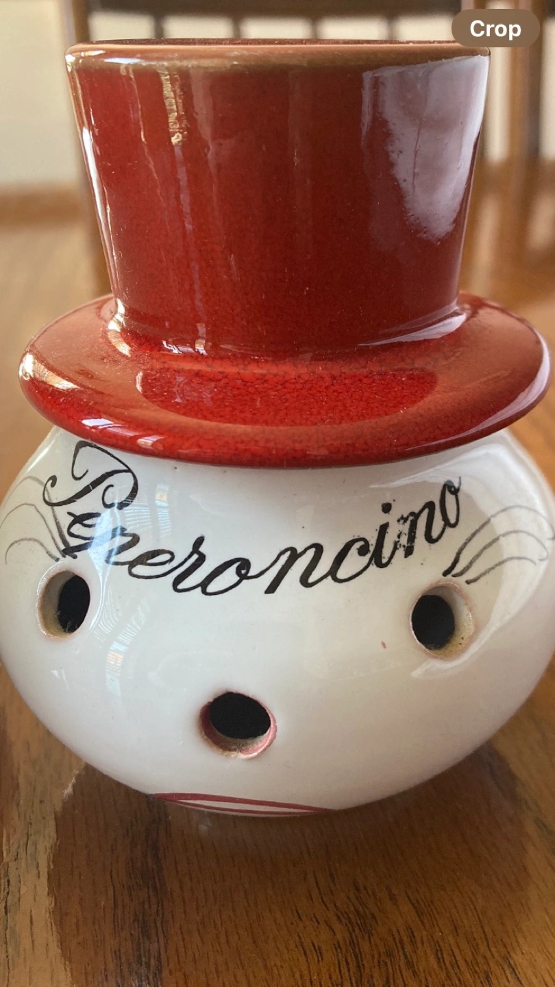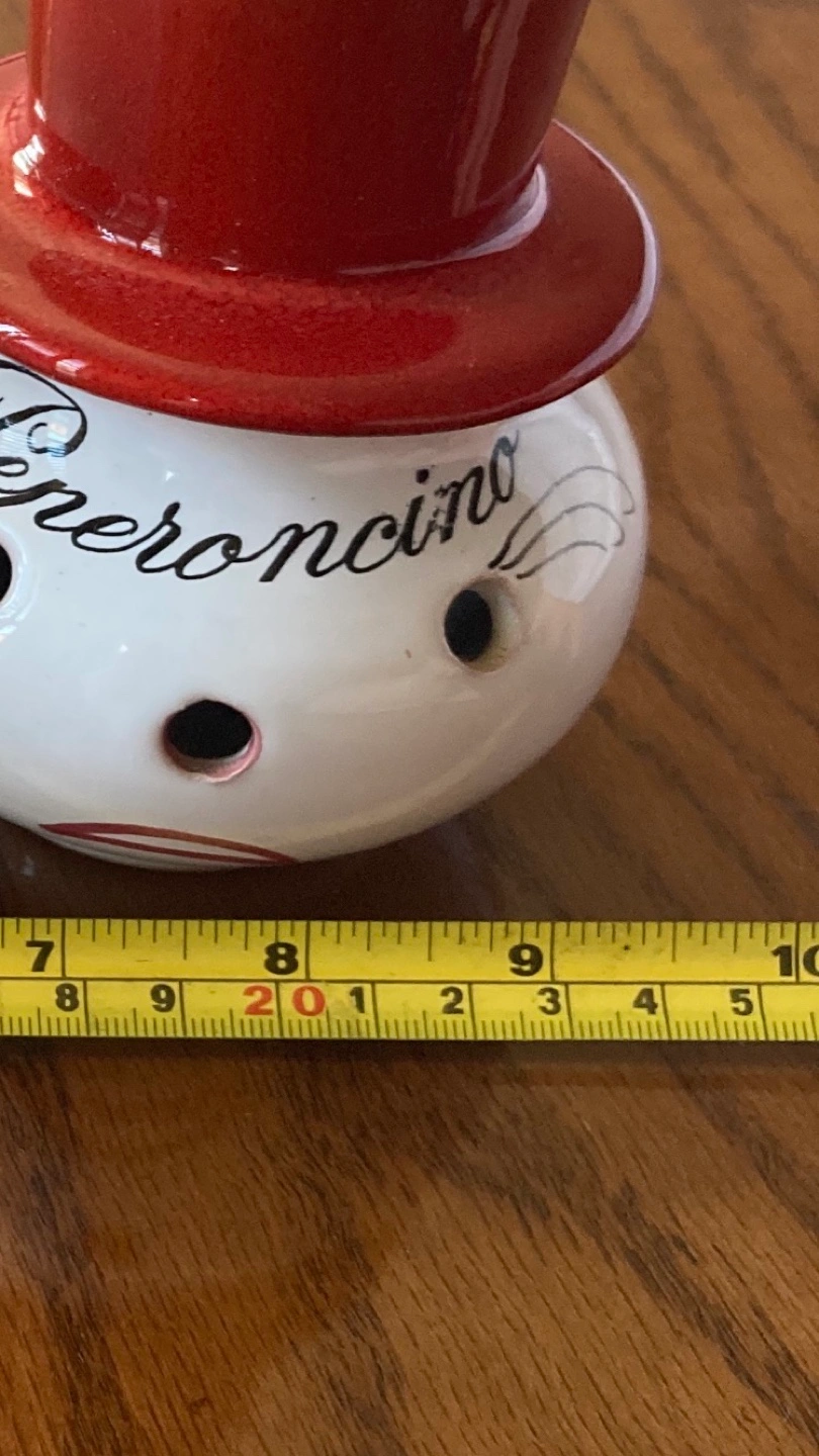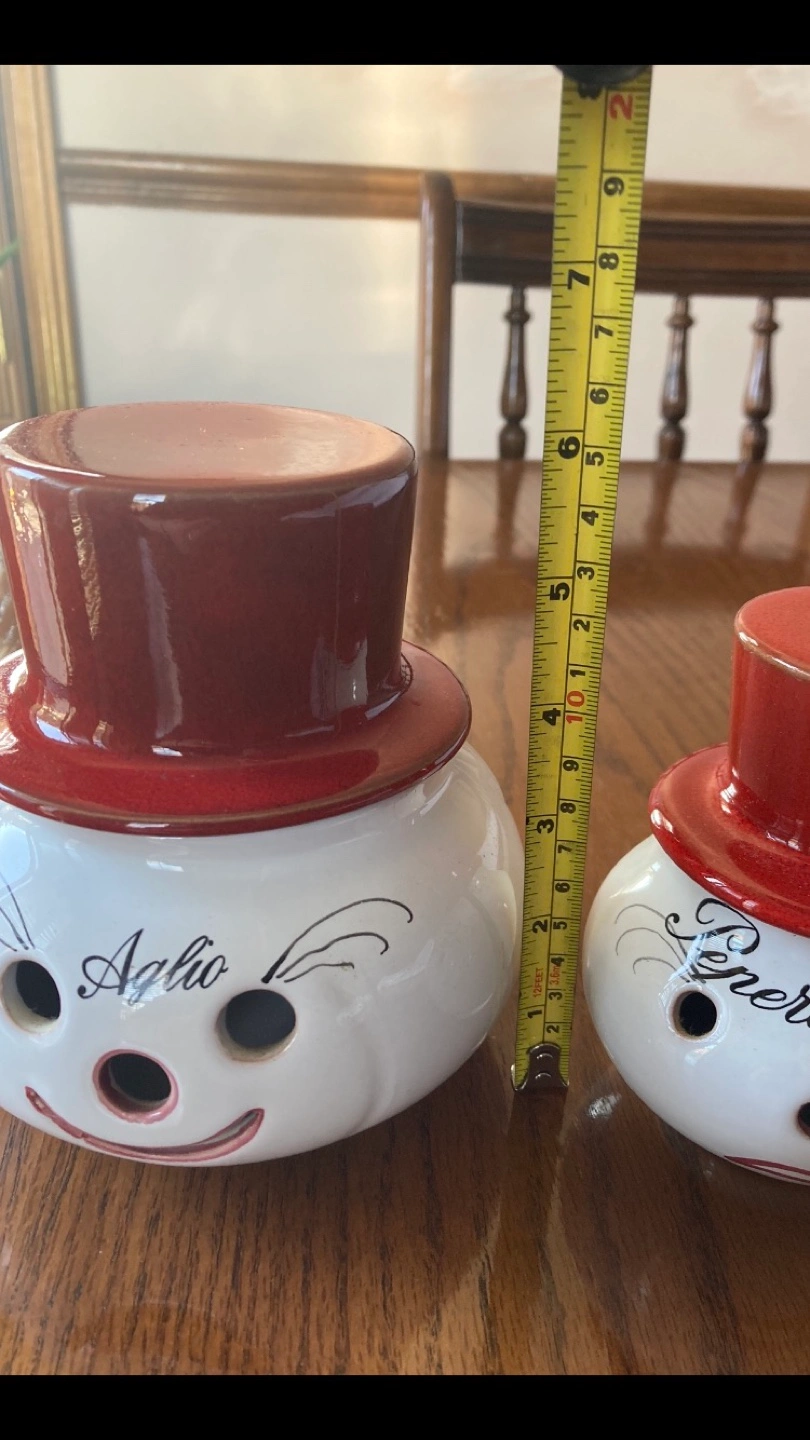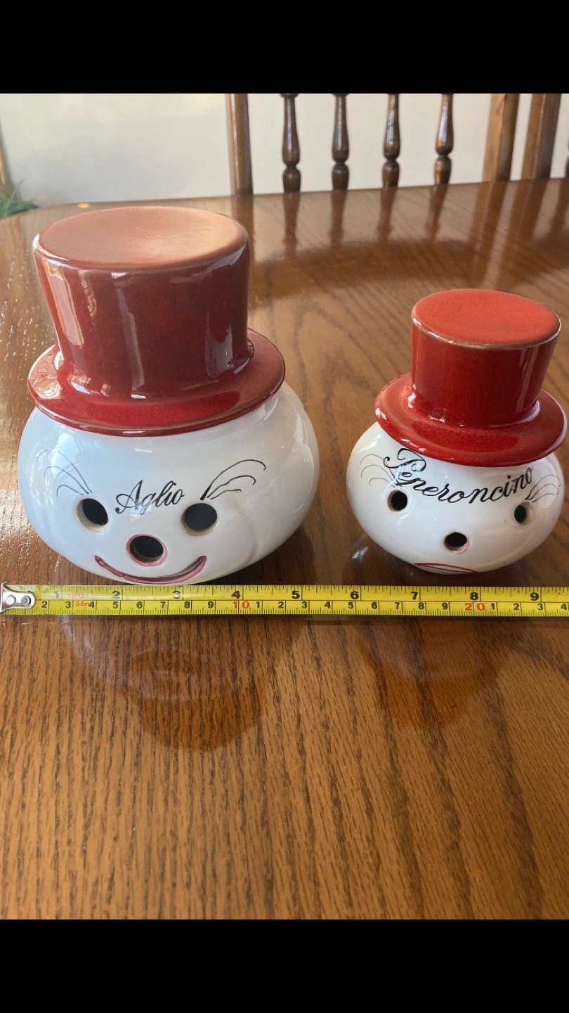Adorable set of two vintage ceramic pepper and garlic holders. Each features a whimsical snowman design with a red hat. One says "Peperoncino" and the other says "Aglio". Perfect for adding a touch of charm to your kitchen.