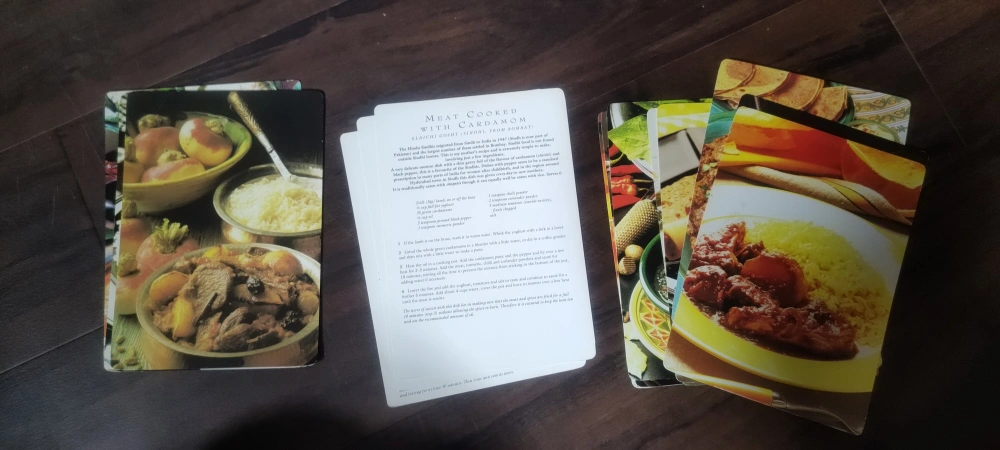 13 of these recipe cards with Indian and Bengal recipes. No idea where they are from. Each card is glossy and has photos of the food. These appear to be vintage, at least 30 years old.
