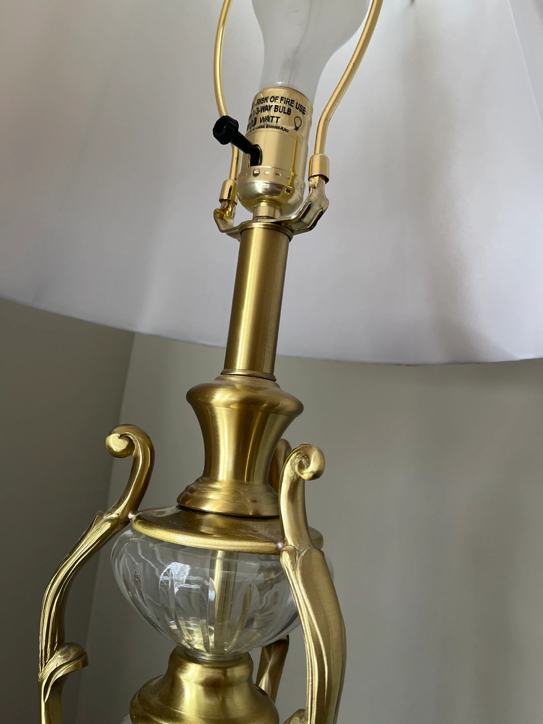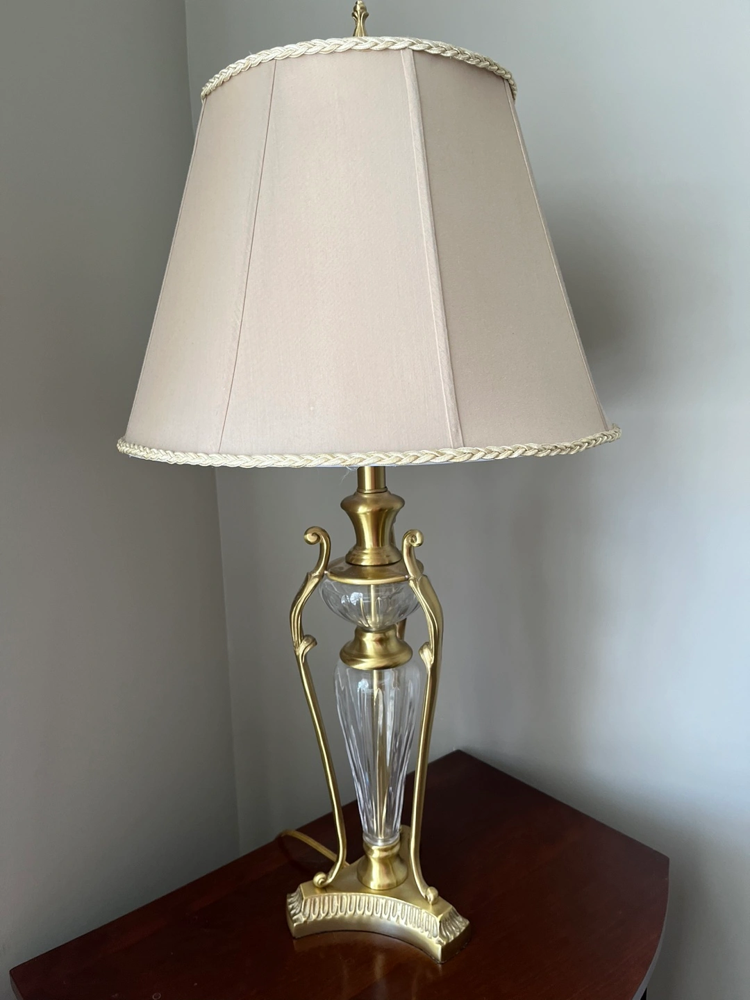 Beautiful table lamp. Features a brass base and crystal accents. Beige lampshade with braided trim. Great addition to any home decor.
