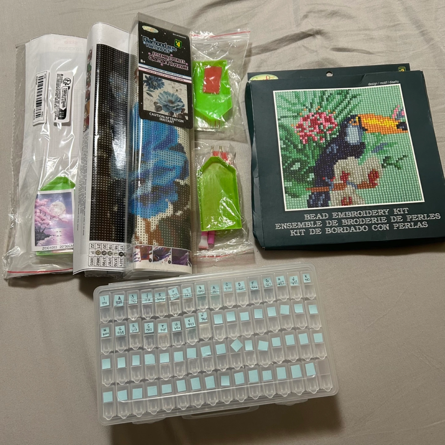 Various designs including toucan, blue flowers, and cherry blossoms.
