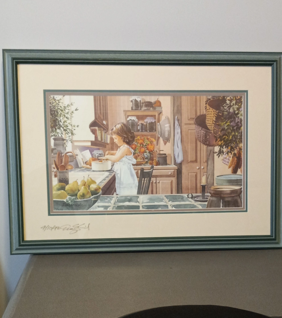 29Doug Laird limited edition print, signed and numbered 99 of 1250, signed on glass by artist at one of his showings 1998. Title "Homemade pie", triple matted, frame a bluish gray, size 28 by 20 inches. pre-owned, excellent condition, priced to sell