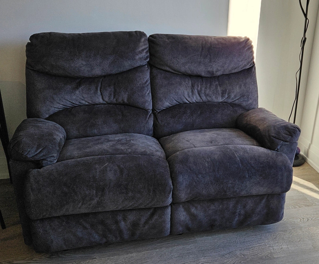 Comfortable reclining loveseat. Dark grey fabric.