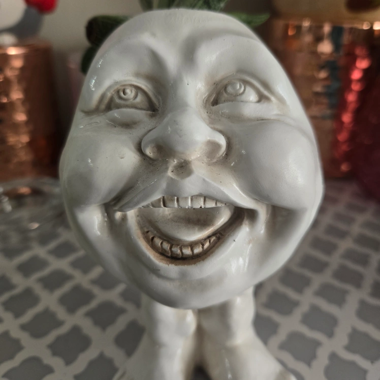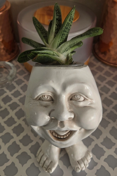 Cute quirky planter. Features a smiling face and little feet. Includes a small succulent. Great for adding a touch of whimsy to your home decor.