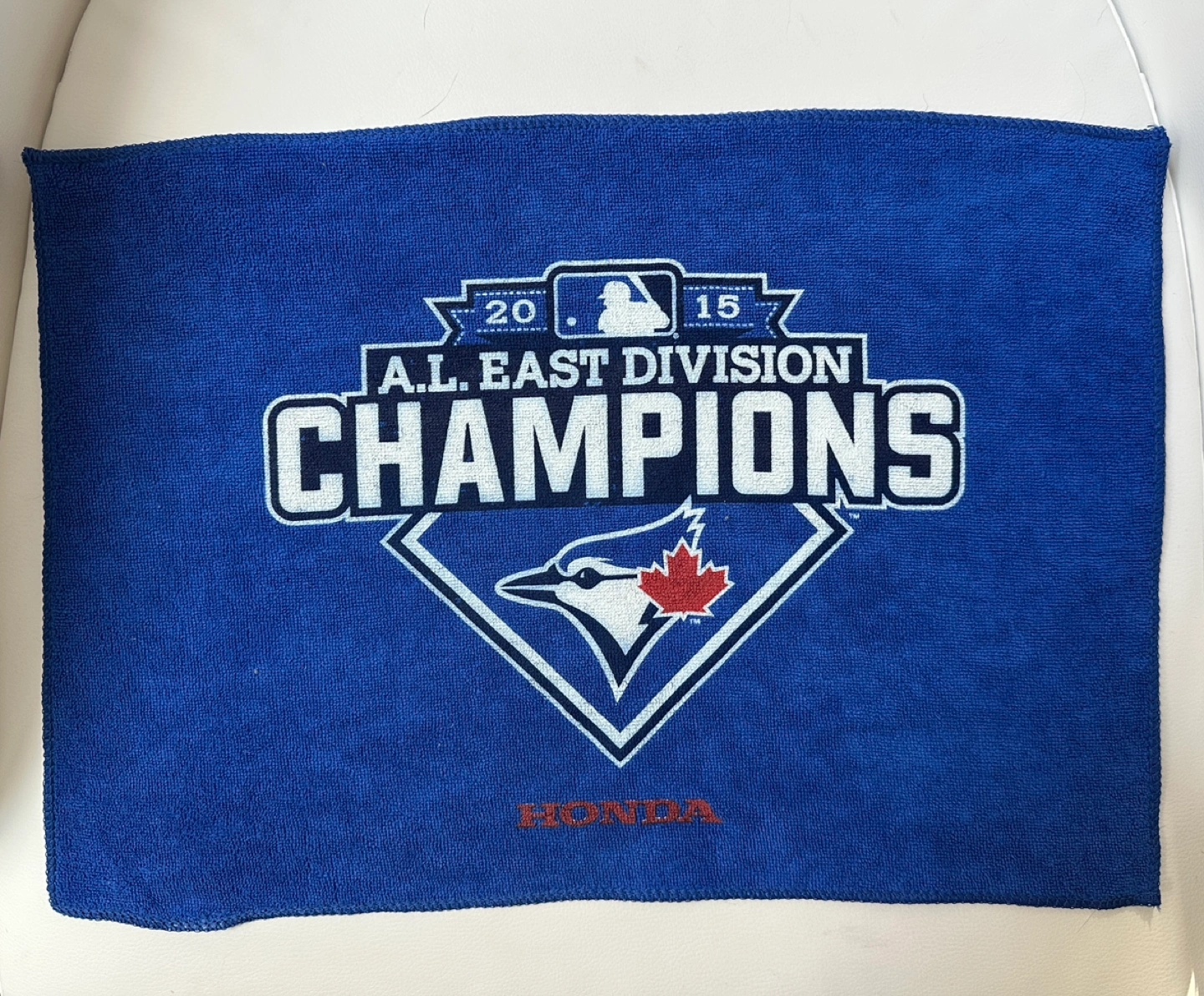 Blue microfiber towel. Features the 2015 Toronto Blue Jays AL East Division Champions logo. Sponsored by Honda. Great for cleaning or collecting.