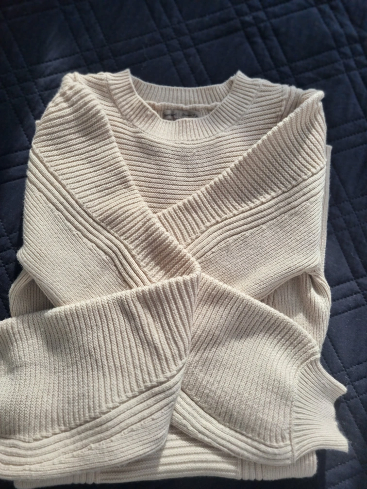 Long-sleeved sweater dress. Cream colour. Ribbed knit texture. Fitted silhouette. Round neckline.