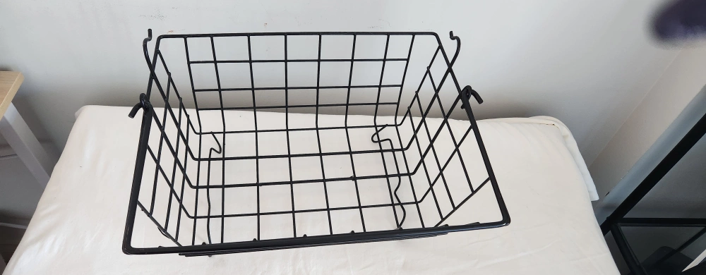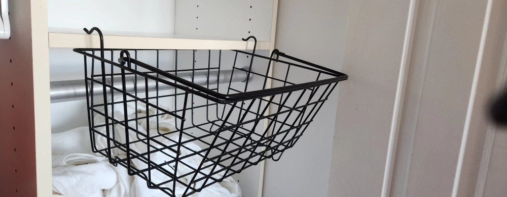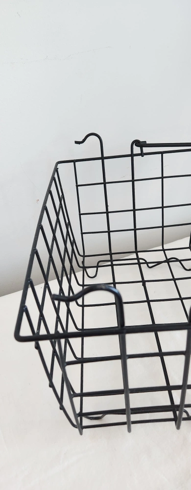 354Black wire basket. Great for closet organization. Hangs from a rod. Durable metal construction. Lightweight and easy to install.
