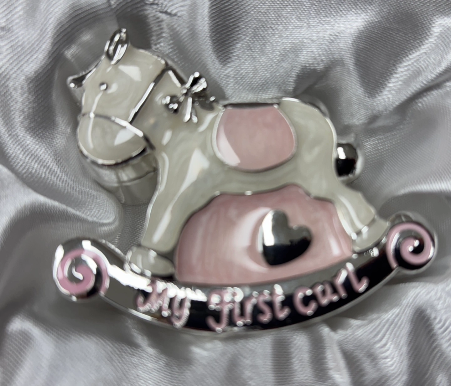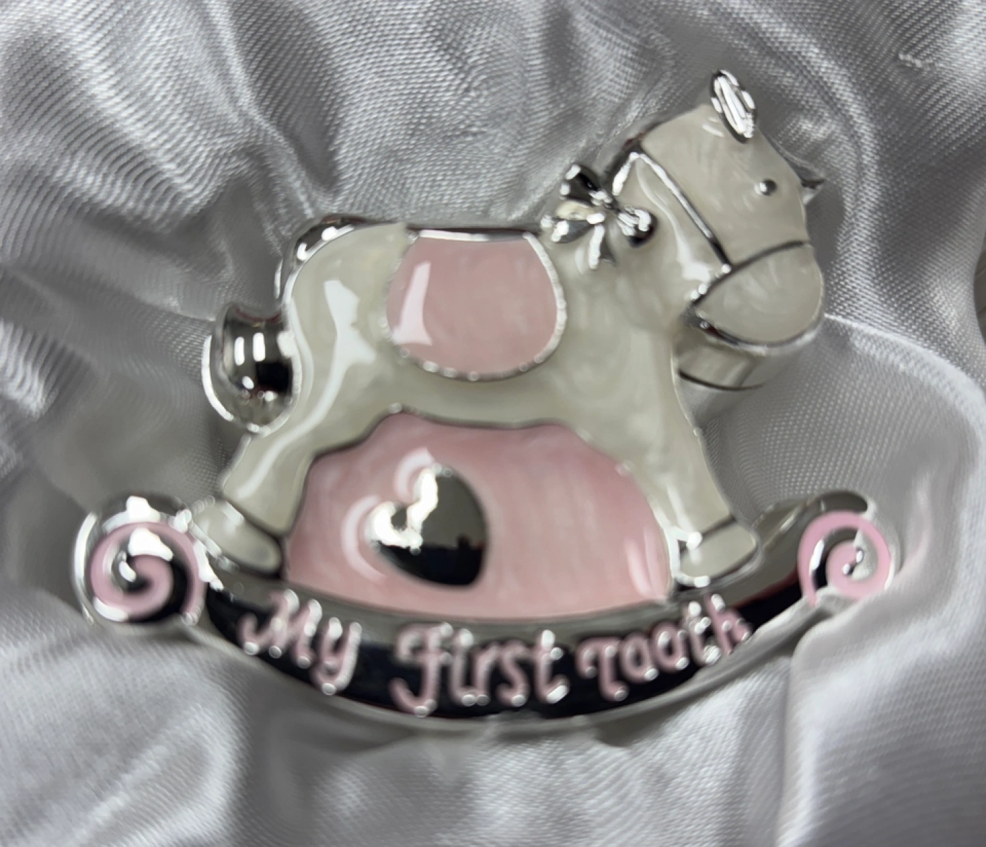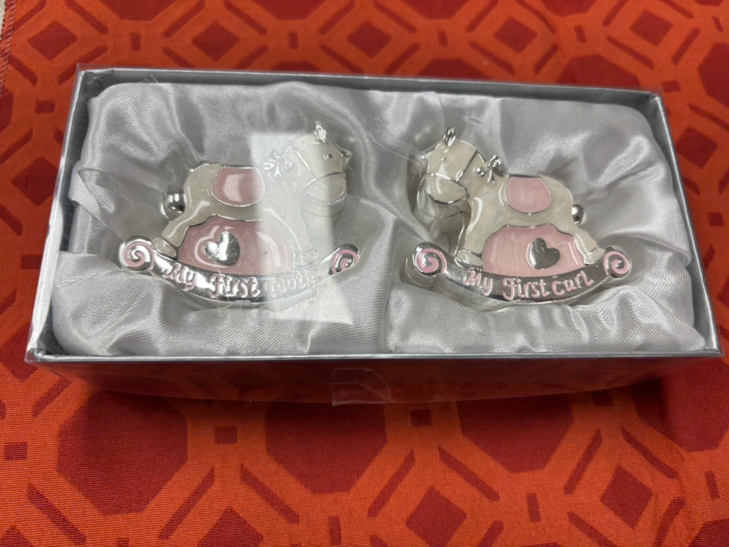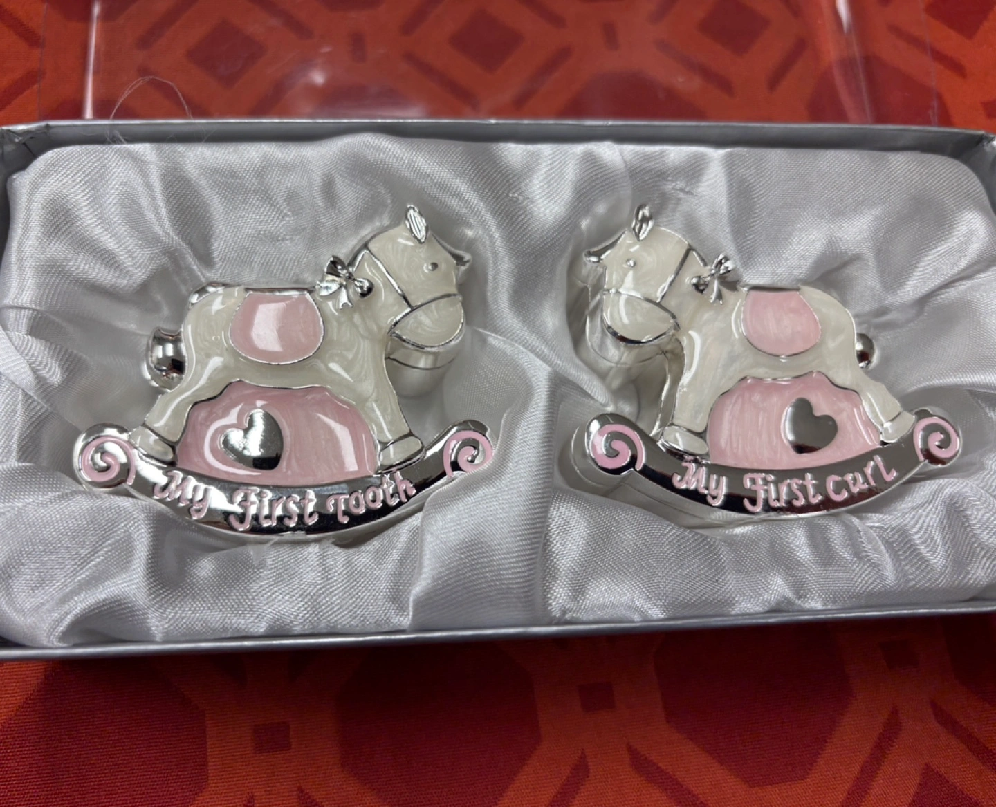 106Adorable set of two keepsake boxes. Pink and white rocking horse theme. One box for a baby's first tooth, the other for their first curl. Silver-toned metal with enamel detailing. Comes in original box.