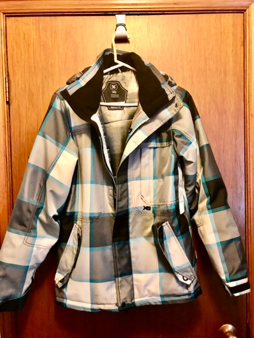Men's Ripzone snow jacket. Size small. Features a plaid pattern in grey, blue and white. Zipper closure. Hood. Multiple pockets.