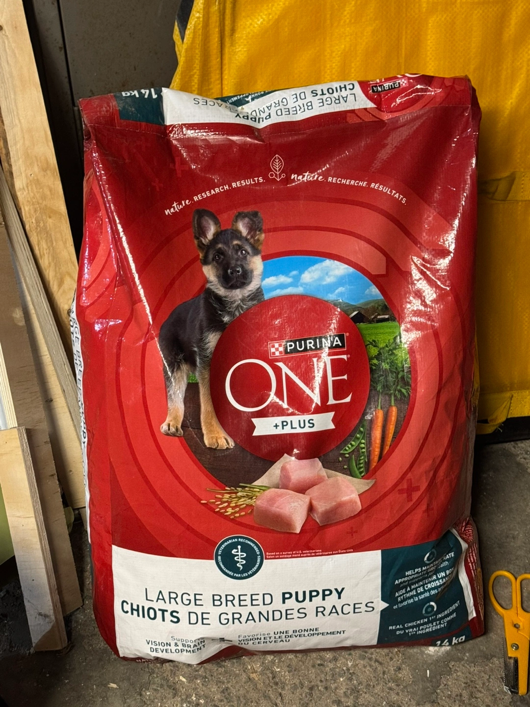 8314kg bag of Purina ONE Plus Large Breed Puppy food. Supports vision and brain development. Real chicken ingredient. Got two bags and found out puppy is allergic! Can’t return as we don’t have receipt.