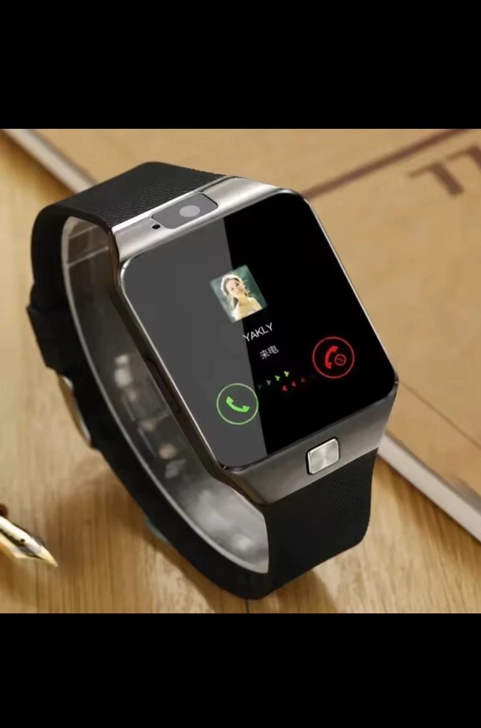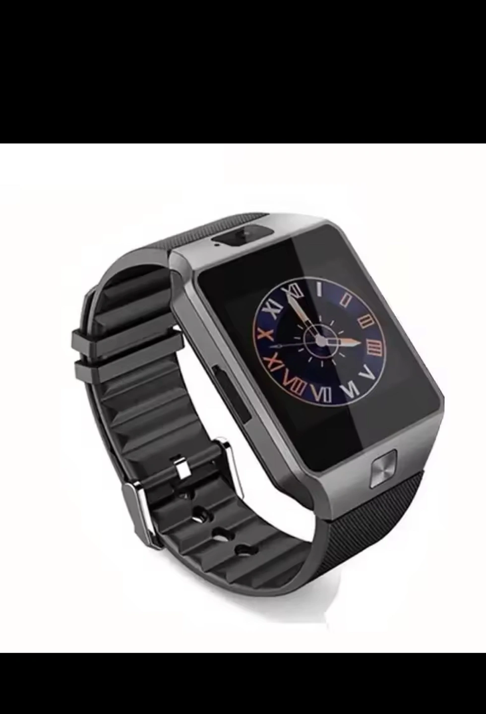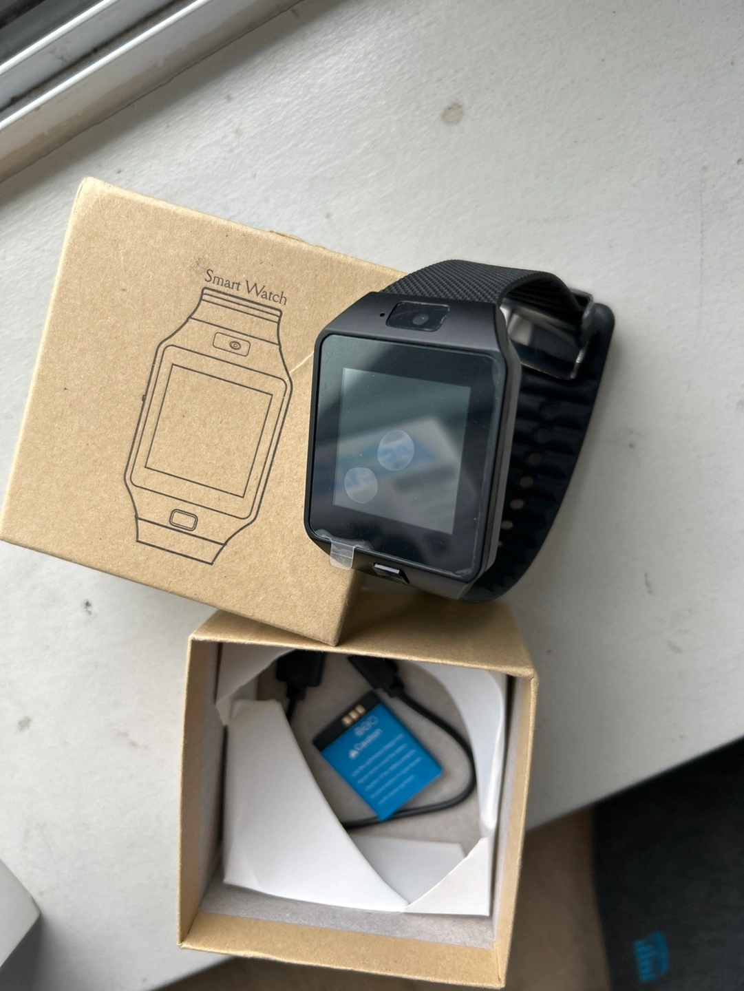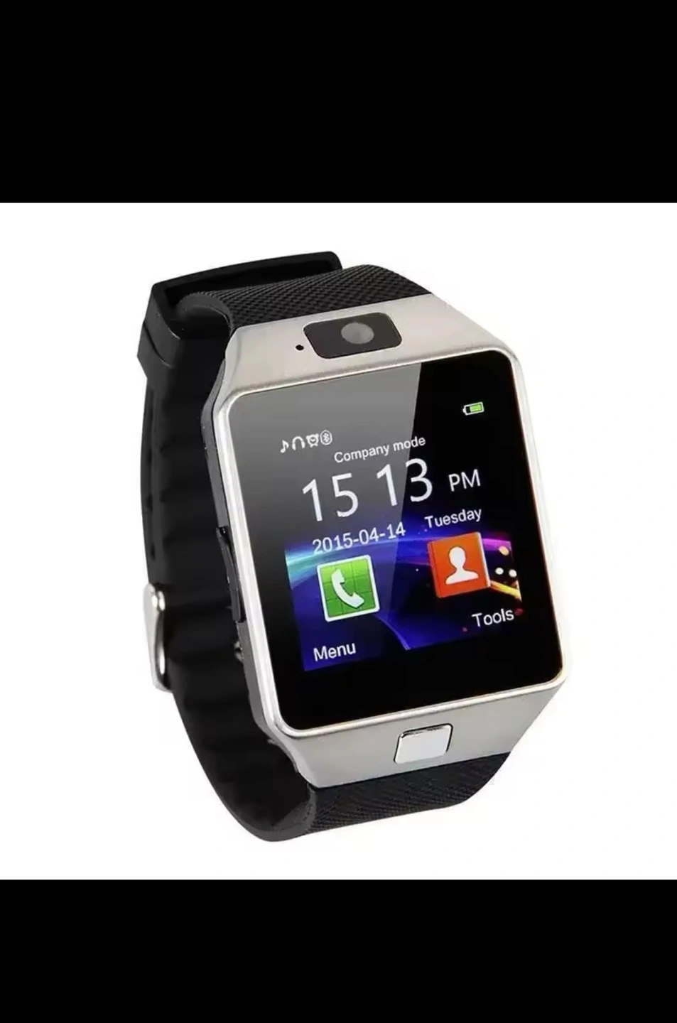 Pre-owned smartwatch. Features touchscreen, Bluetooth, dialer, internet, player, messaging, calendar, alarm clock, calculator. Supports SIM card. Black band. Silver bezel.