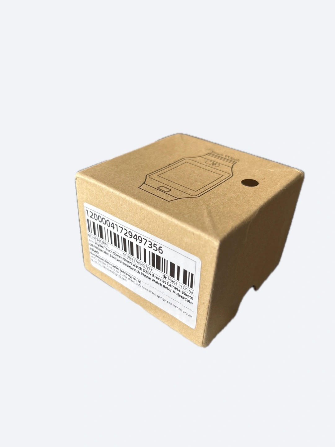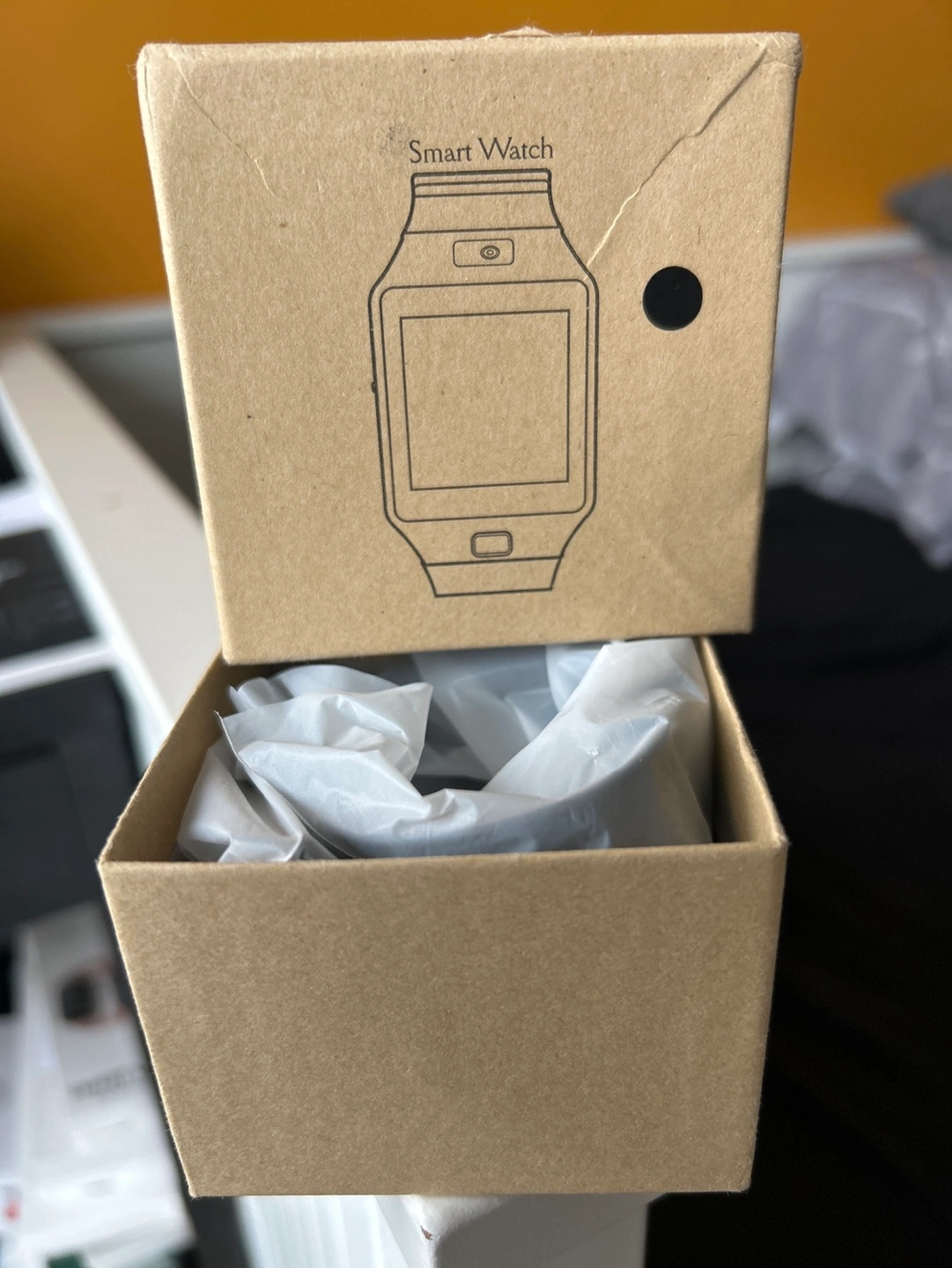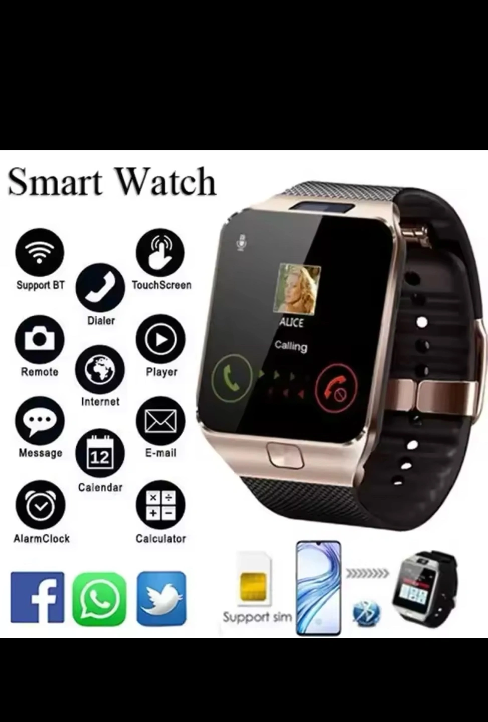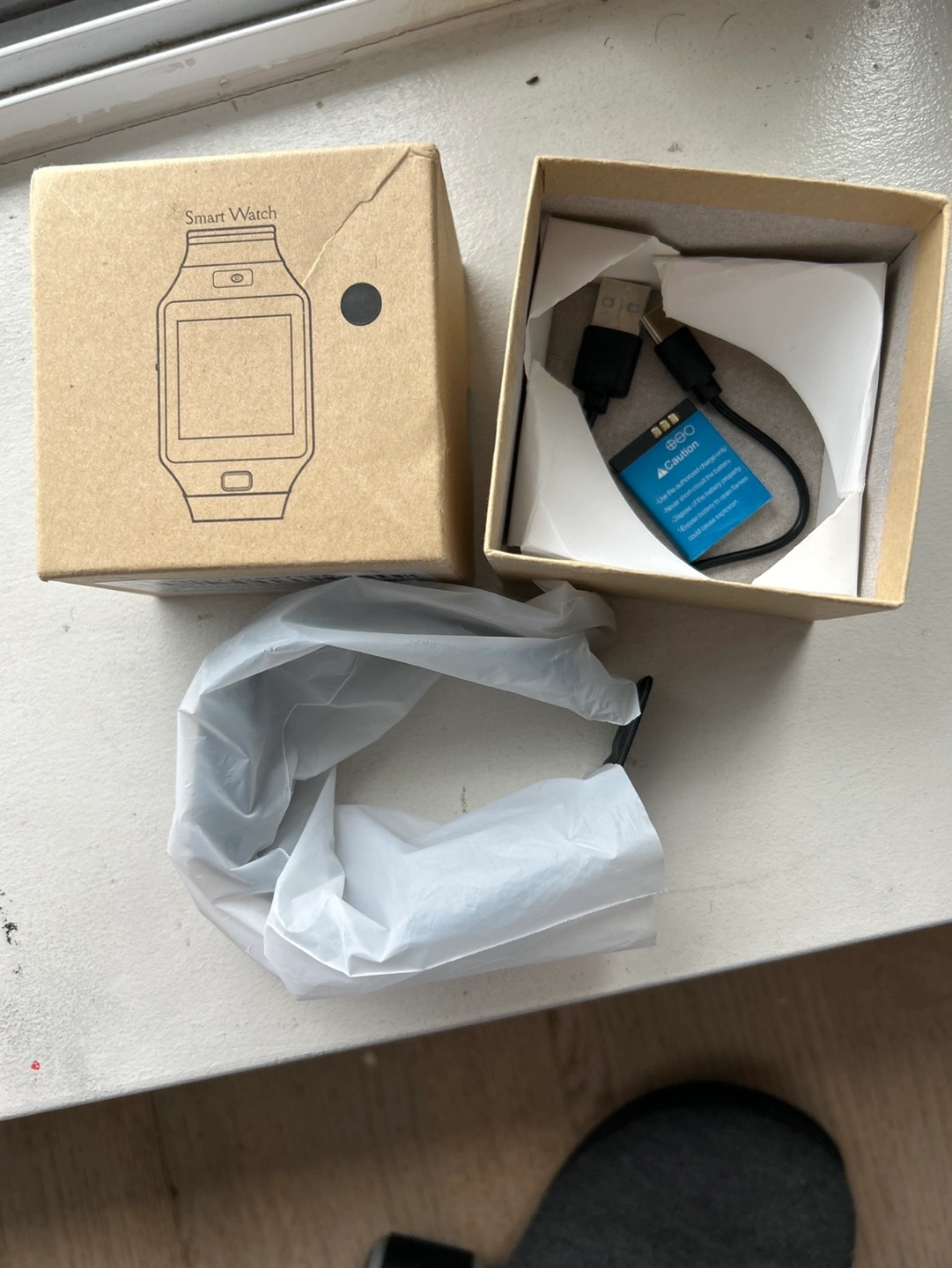Pre-owned smartwatch. Features touchscreen, Bluetooth, dialer, internet, player, messaging, calendar, alarm clock, calculator. Supports SIM card. Black band. Silver bezel.