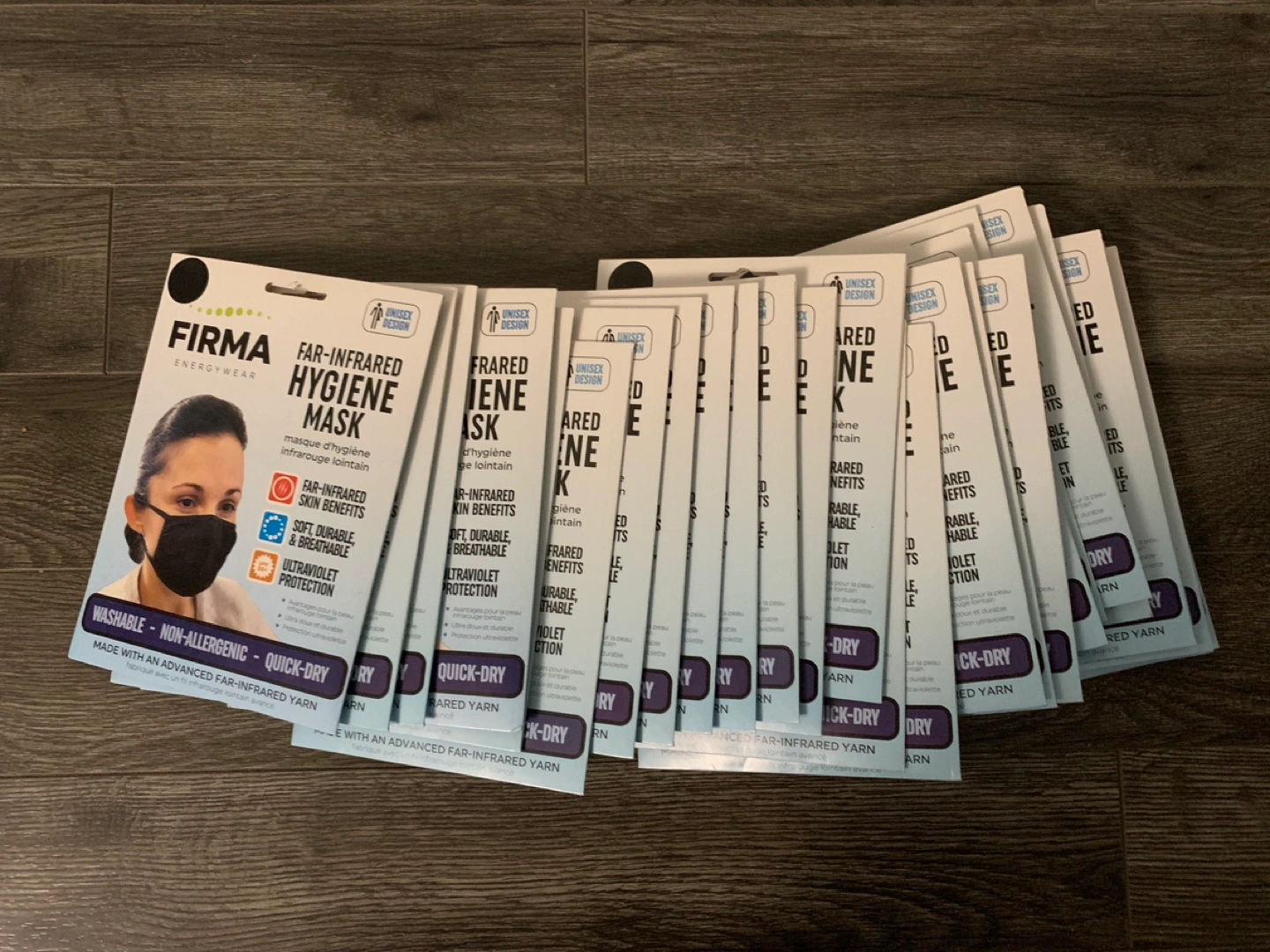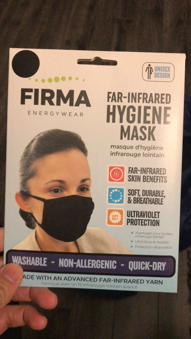Package of FIRMA Energywear far-infrared hygiene masks. Unisex design. Washable, non-allergenic, quick-dry. Soft, durable and breathable. Ultraviolet protection. Made with an advanced far-infrared yarn. $5 each would consider some sort of deal if you buy in bulk πππΎ