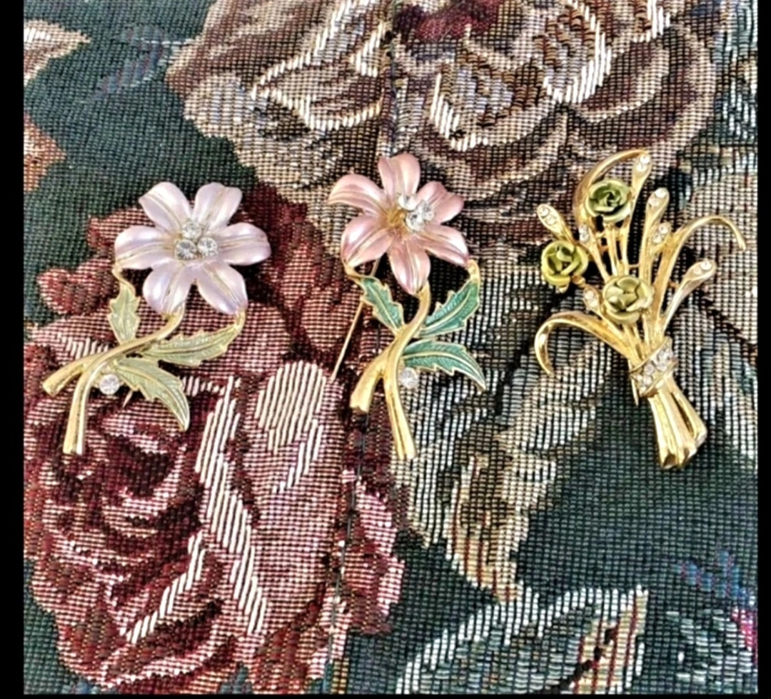 vintage flower-shaped brooches. Gold-tone metal. Pastel pink, green and gold colours. Rhinestone accents. Unique and collectible.