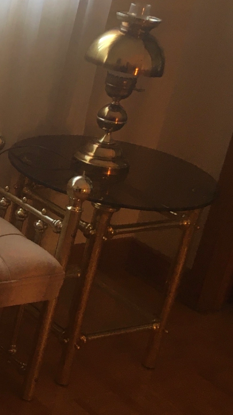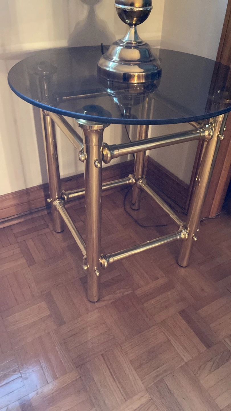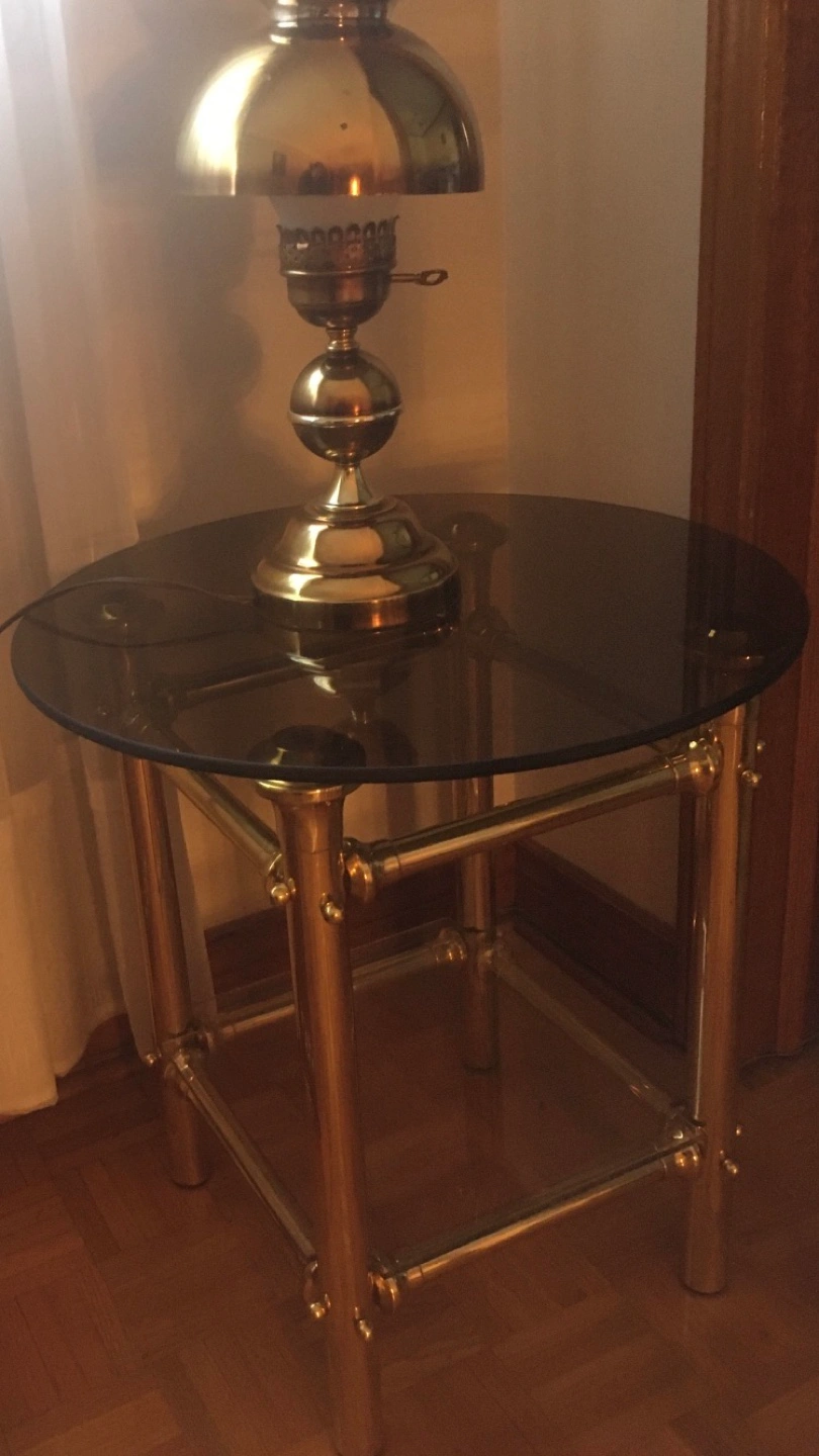 Brass framed side table with round smoke glass top