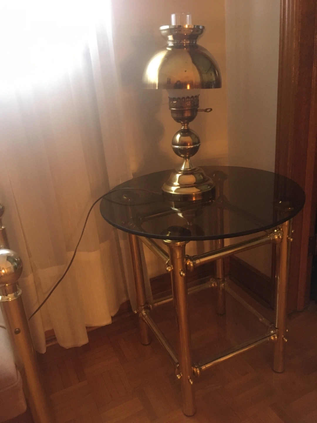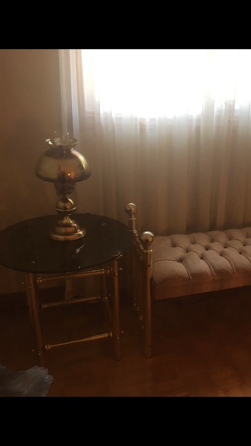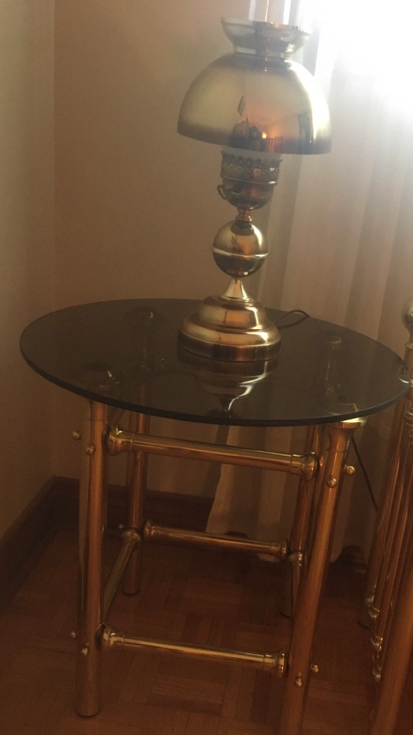 Brass framed side table with round smoke glass top