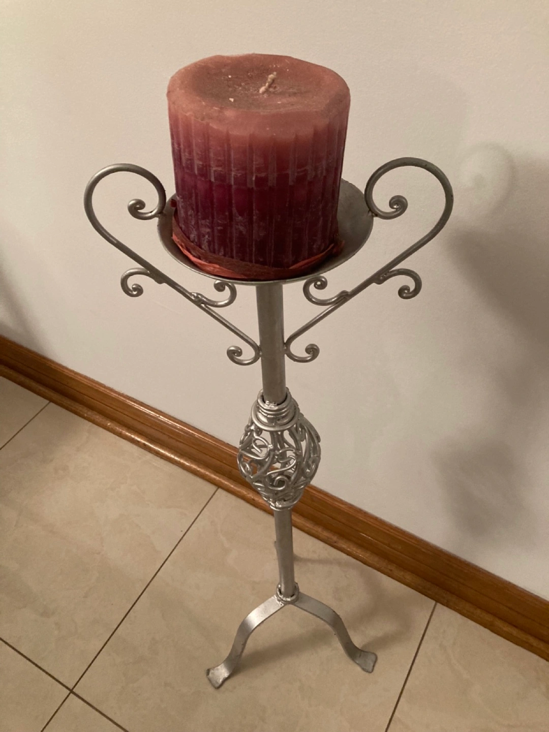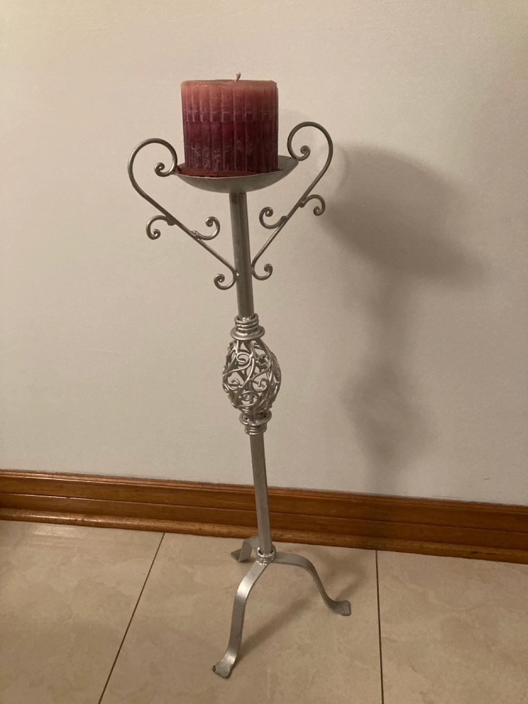 Elegant floor candle holder. Features ornate metalwork. Silver finish. Three-legged base. Perfect for pillar candles. Adds a touch of sophistication to any room.