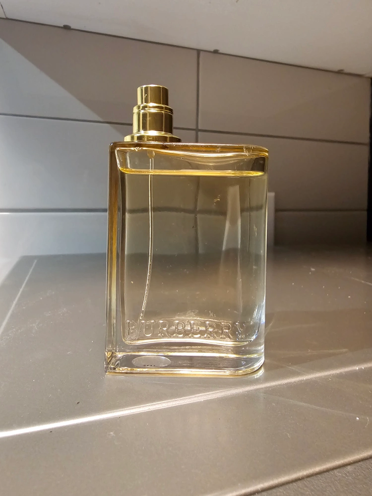 Lightly used Burberry perfume. Gold cap and rectangular glass bottle. 90 % remaining Authentic!!!