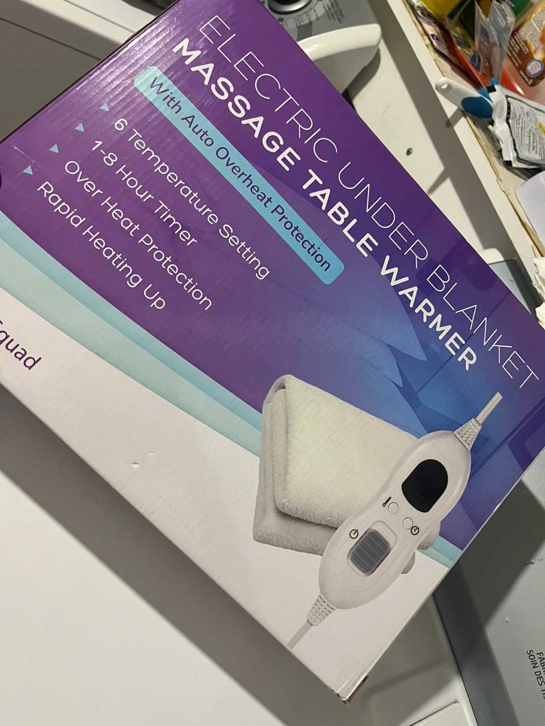 Electric under table blanket warmer with massage function. Features auto overheat protection, 6 temperature settings, 1-8 hour timer, overheat protection, and rapid heating. Brand new in box.