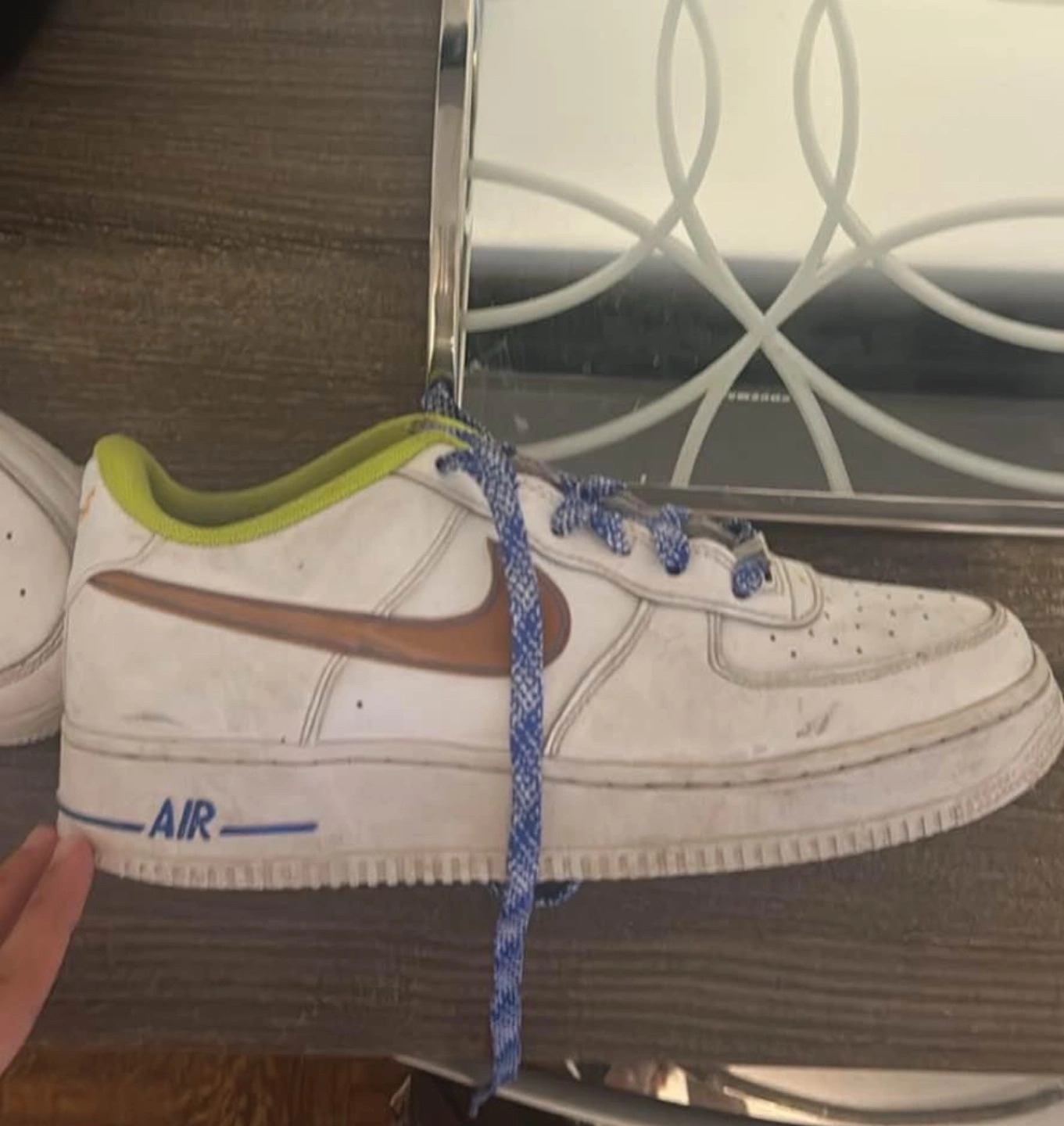 Used white Nike Air Force 1 sneakers. Brown swoosh. Unique laces. Some wear.