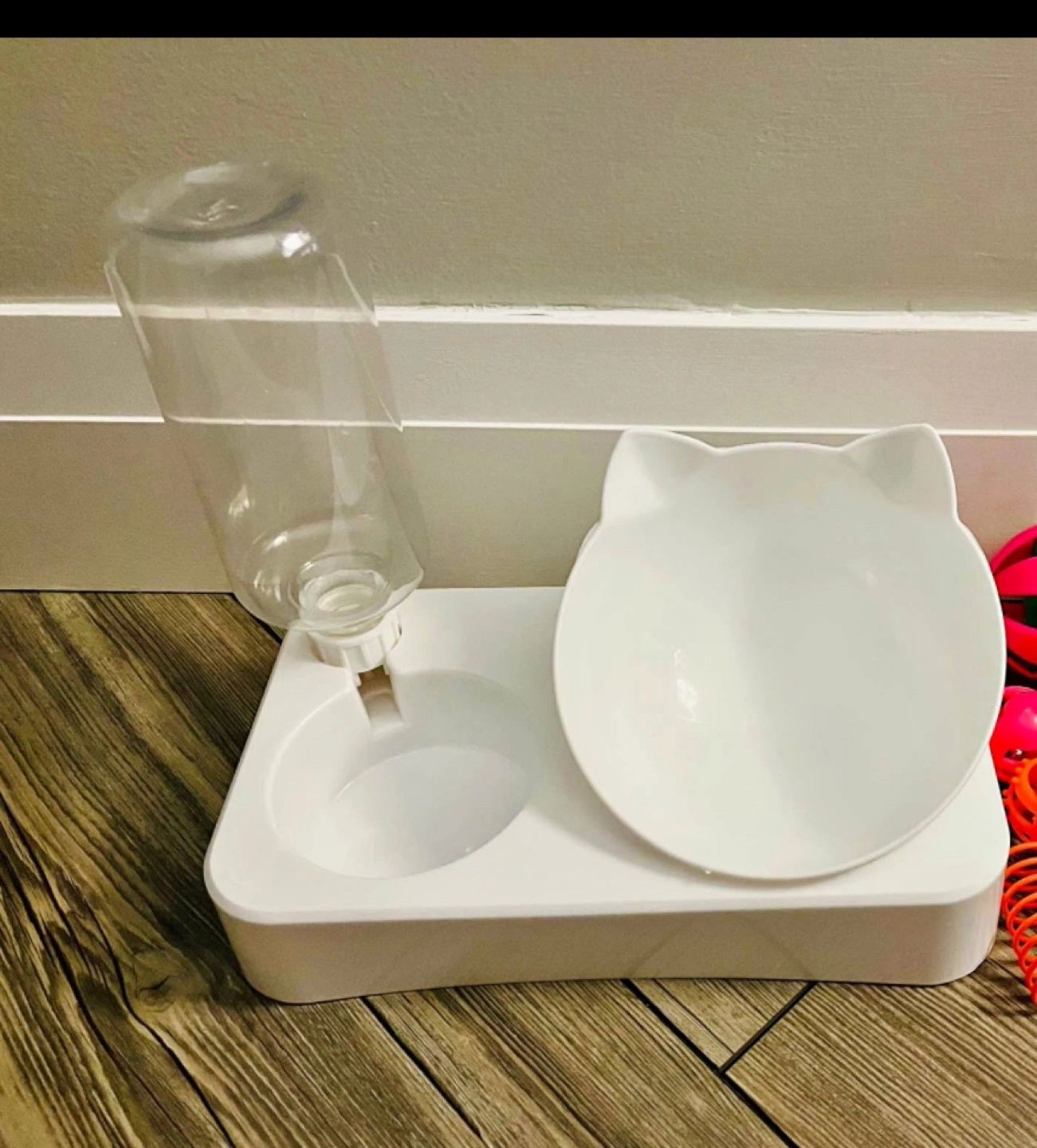 White cat-shaped bowl with attached water dispenser. Two bowls, one for food, one for water. Easy to clean.
