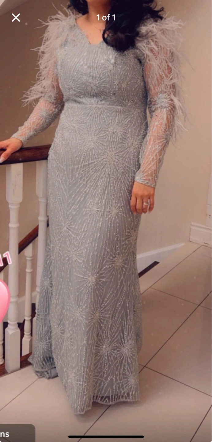 Floor-length gown. Embellished with sparkling details. Features feather accents on the shoulders. Long sleeves. V-neck.