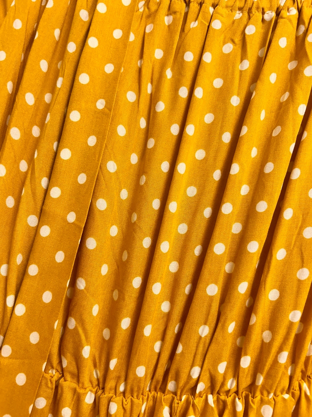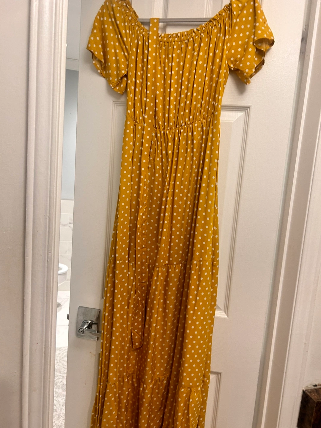 Off-the-shoulder maxi dress. Mustard yellow with white polka dots. Short sleeves. Tiered skirt. Elastic waistband. Self-tie belt.