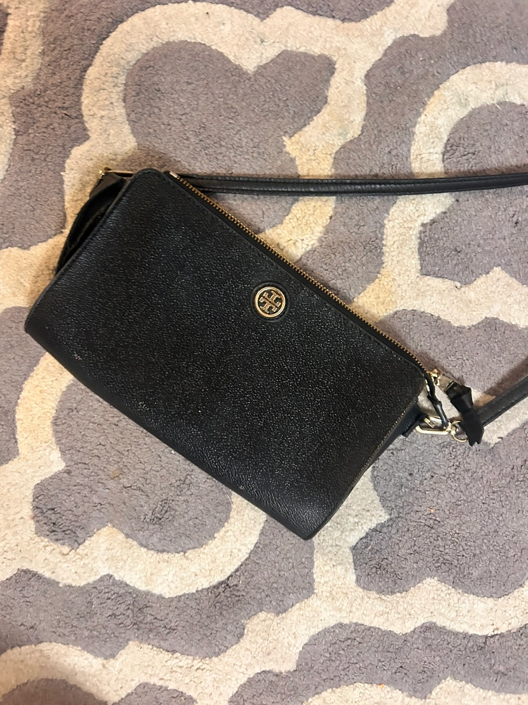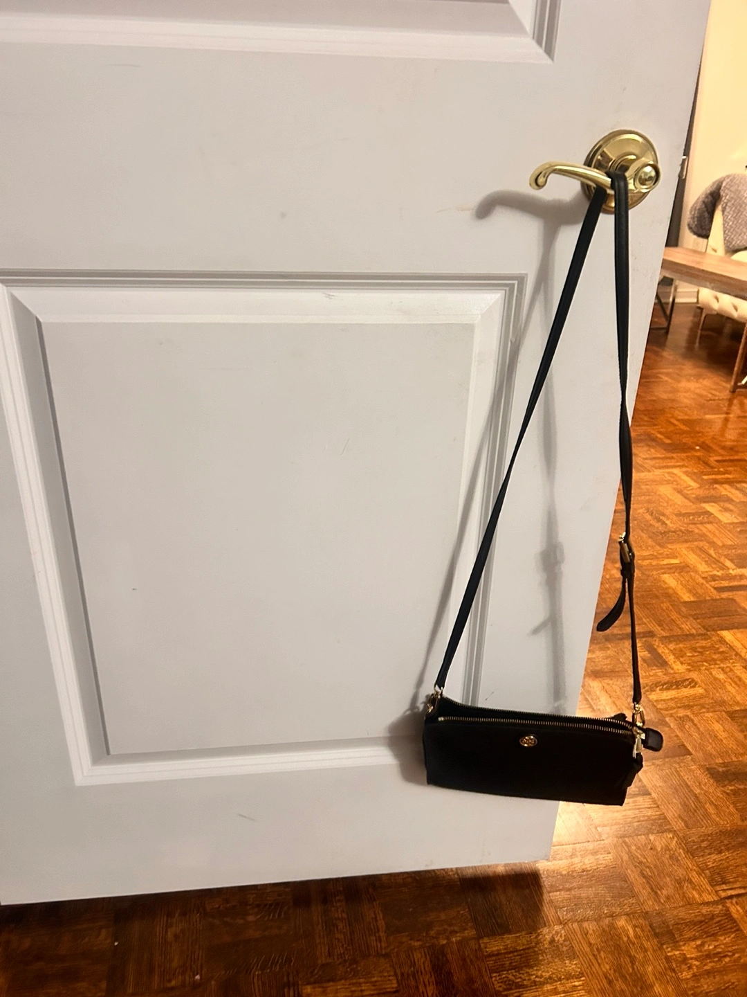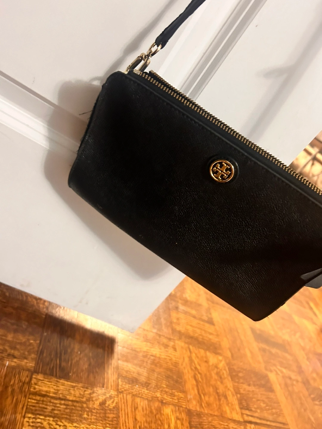 Small black crossbody bag. Features gold hardware and zip closure. Adjustable strap.