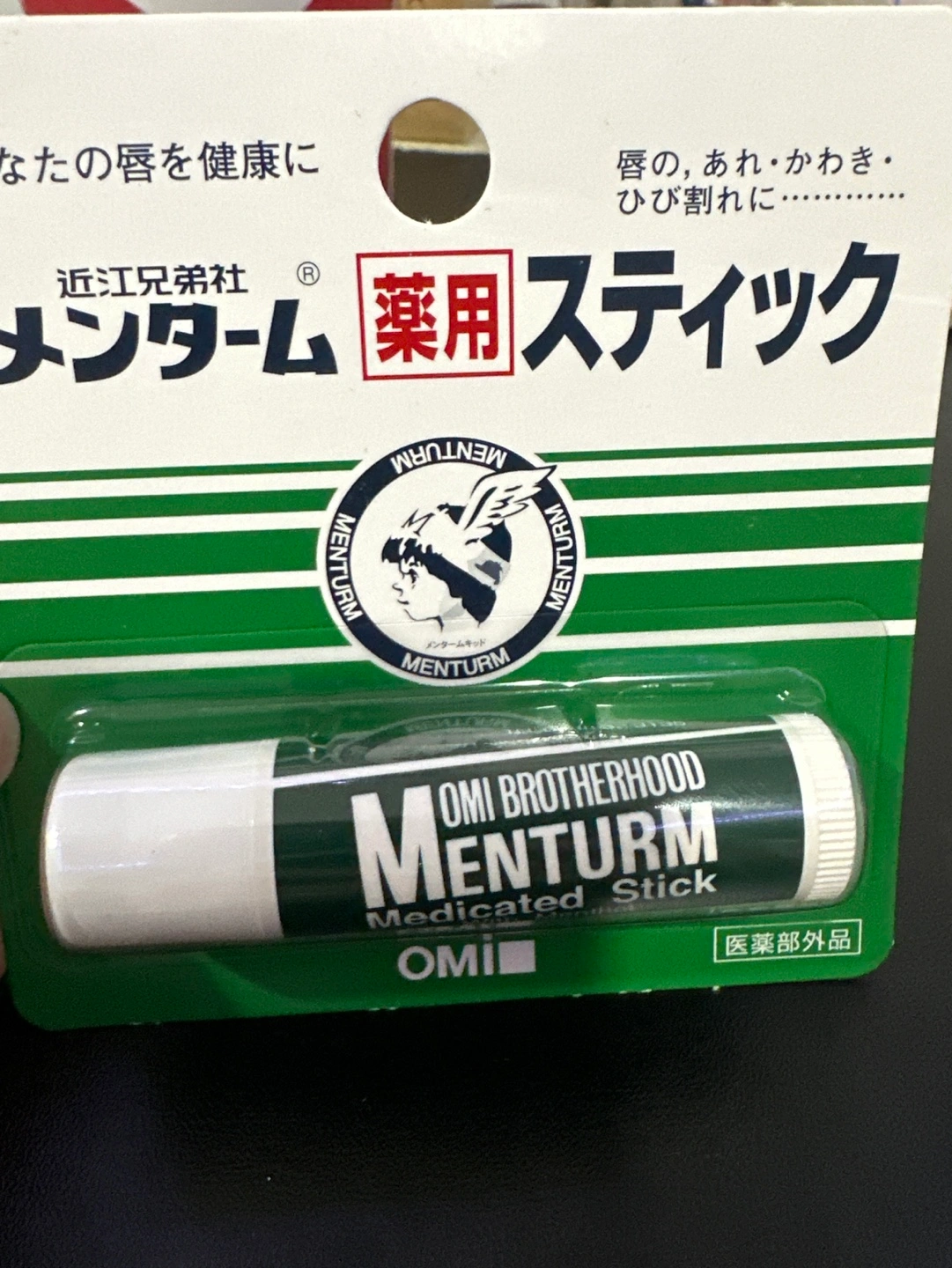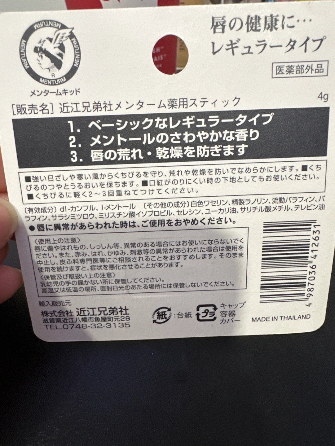 Medicated lip balm stick. Relieves chapped lips. Prevents dryness and cracking. Made in Thailand.