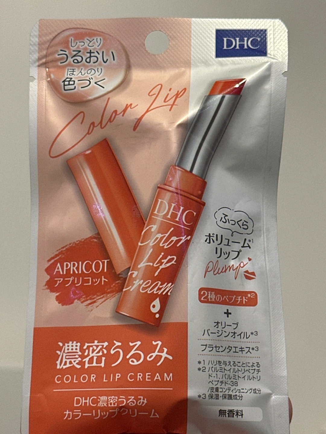 DHC Color Lip Cream in Apricot. Moisturizing lip cream with a hint of colour. Plumping effect. Includes two peptides and other beneficial ingredients.