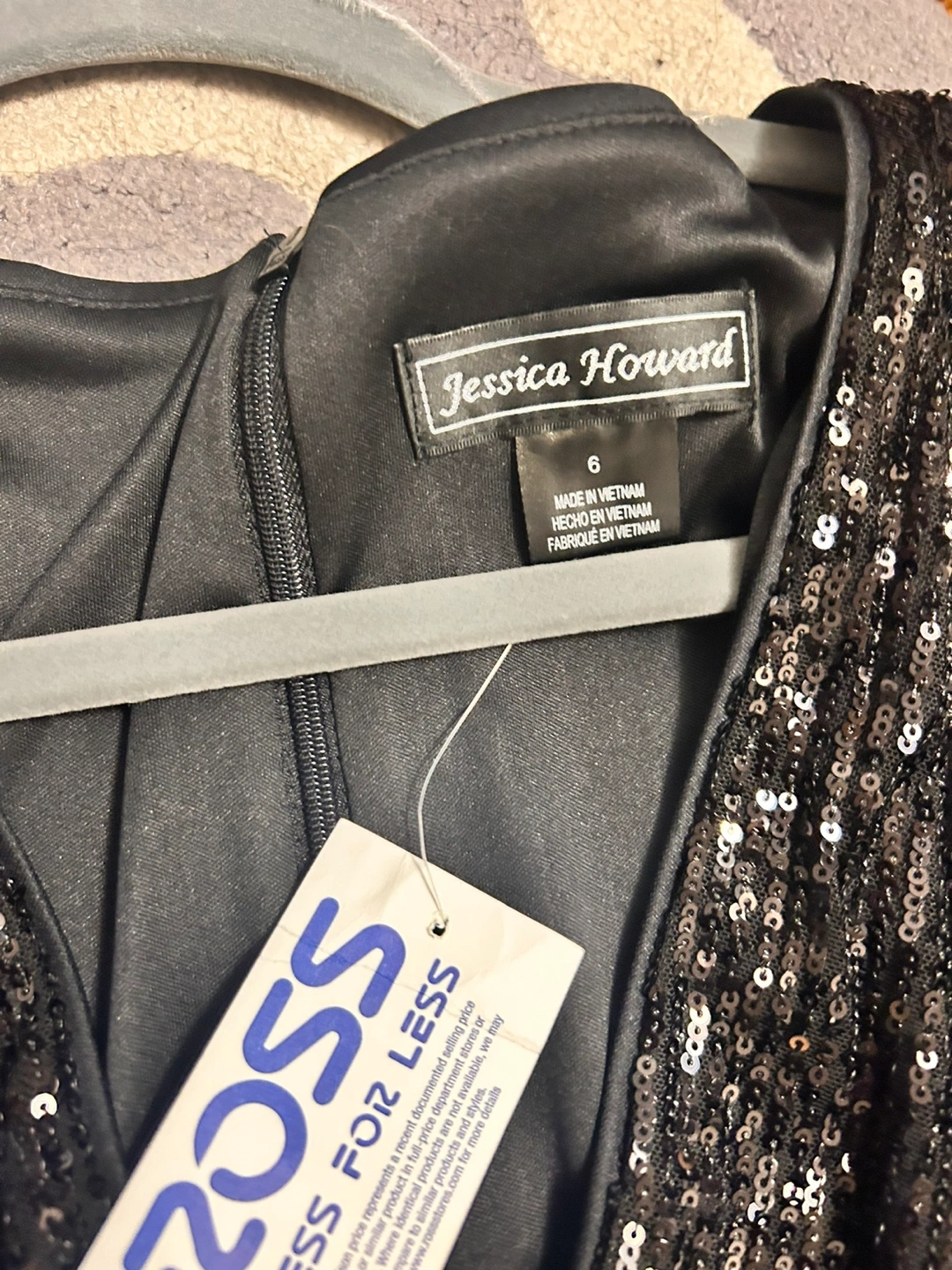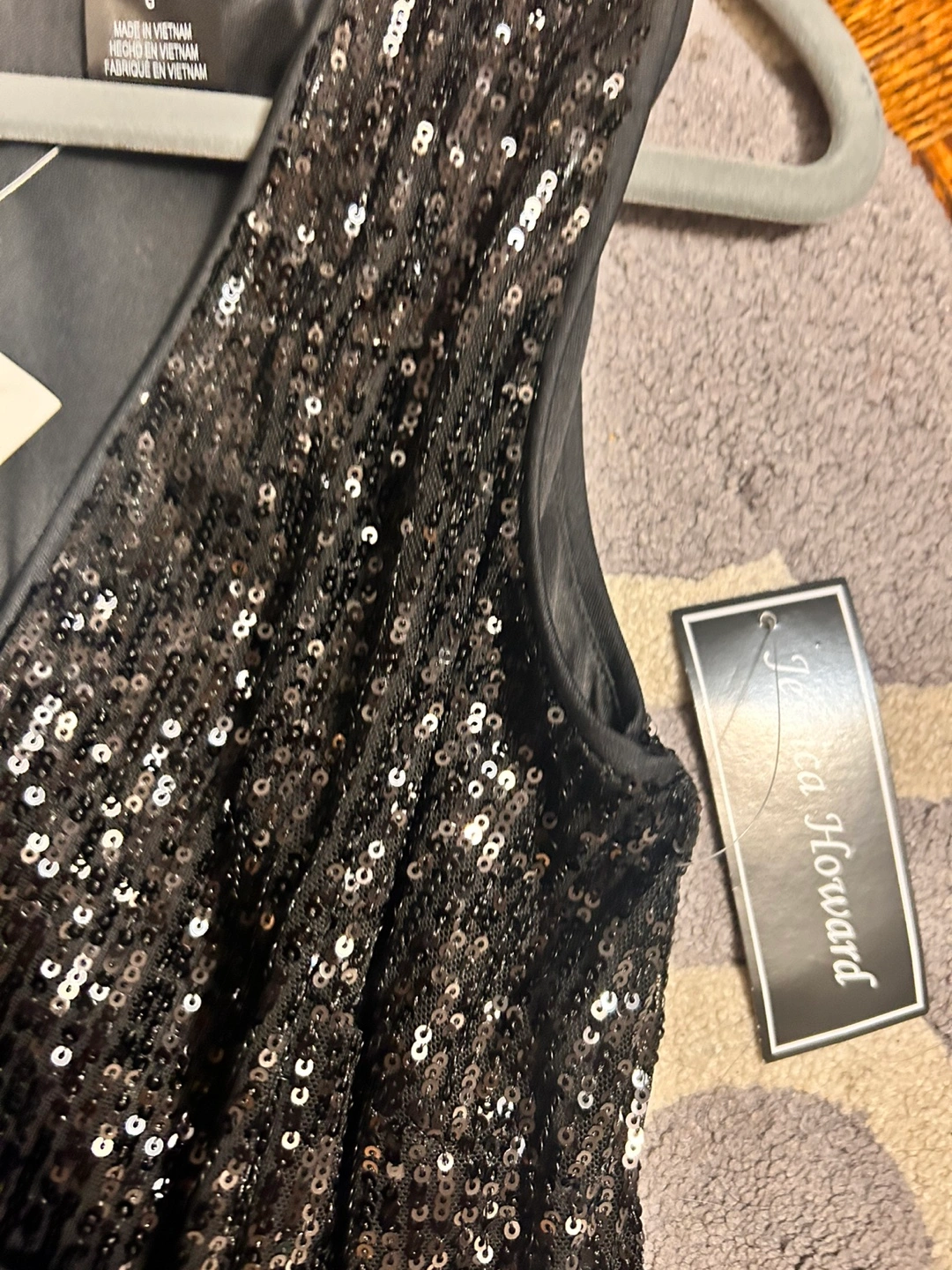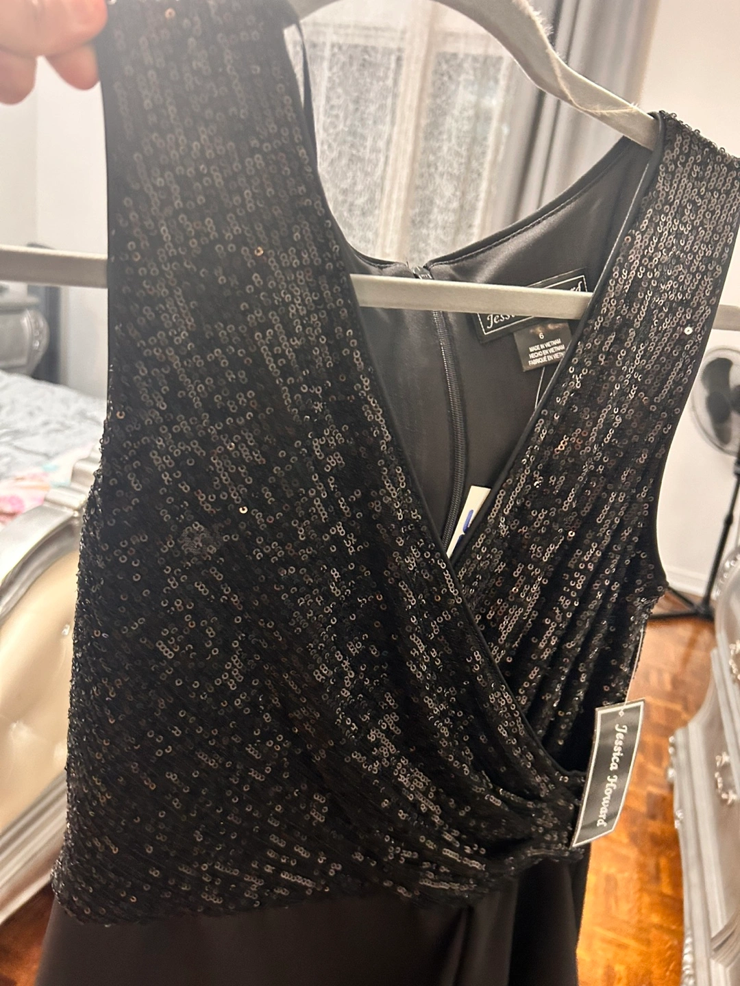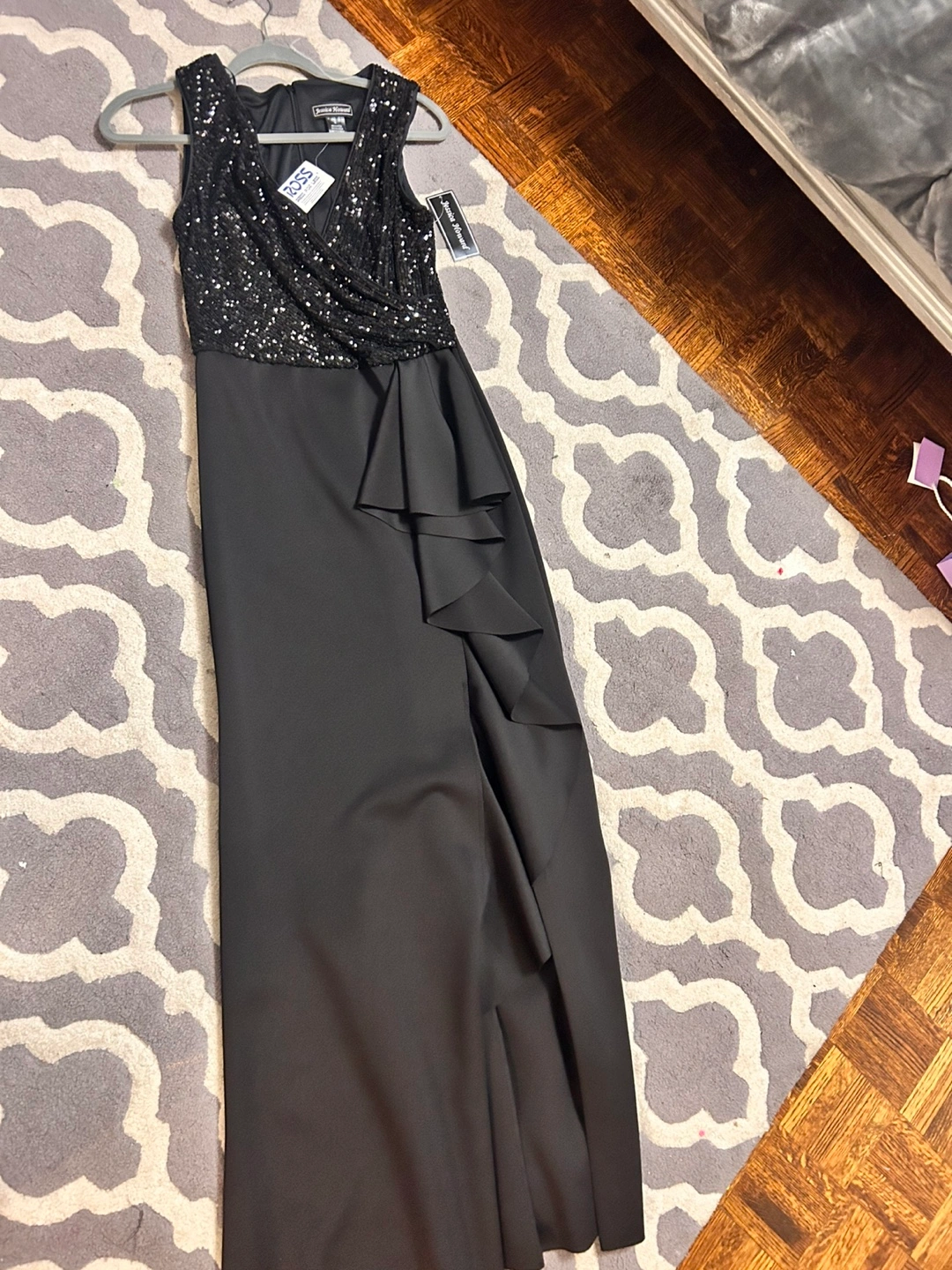 Stunning black maxi dress. Sequin bodice. Ruched skirt. V-neck. Sleeveless. Perfect for a special occasion.