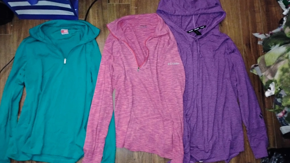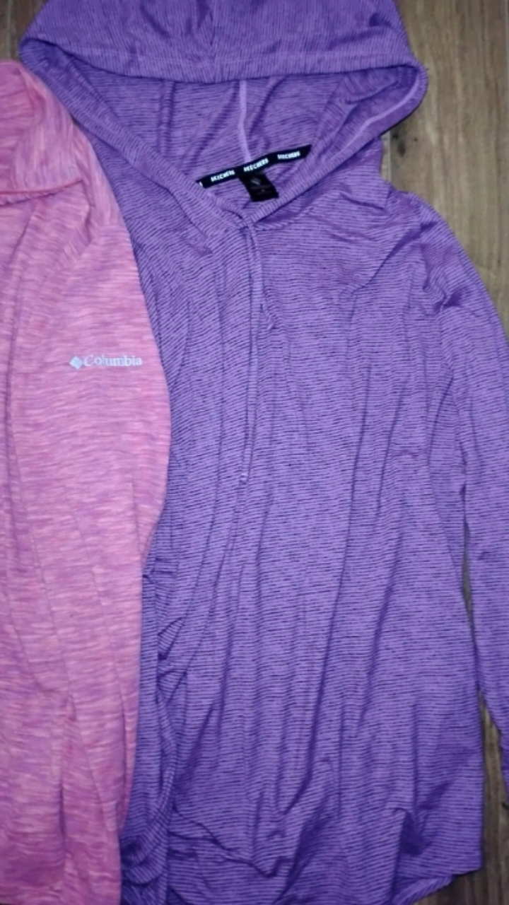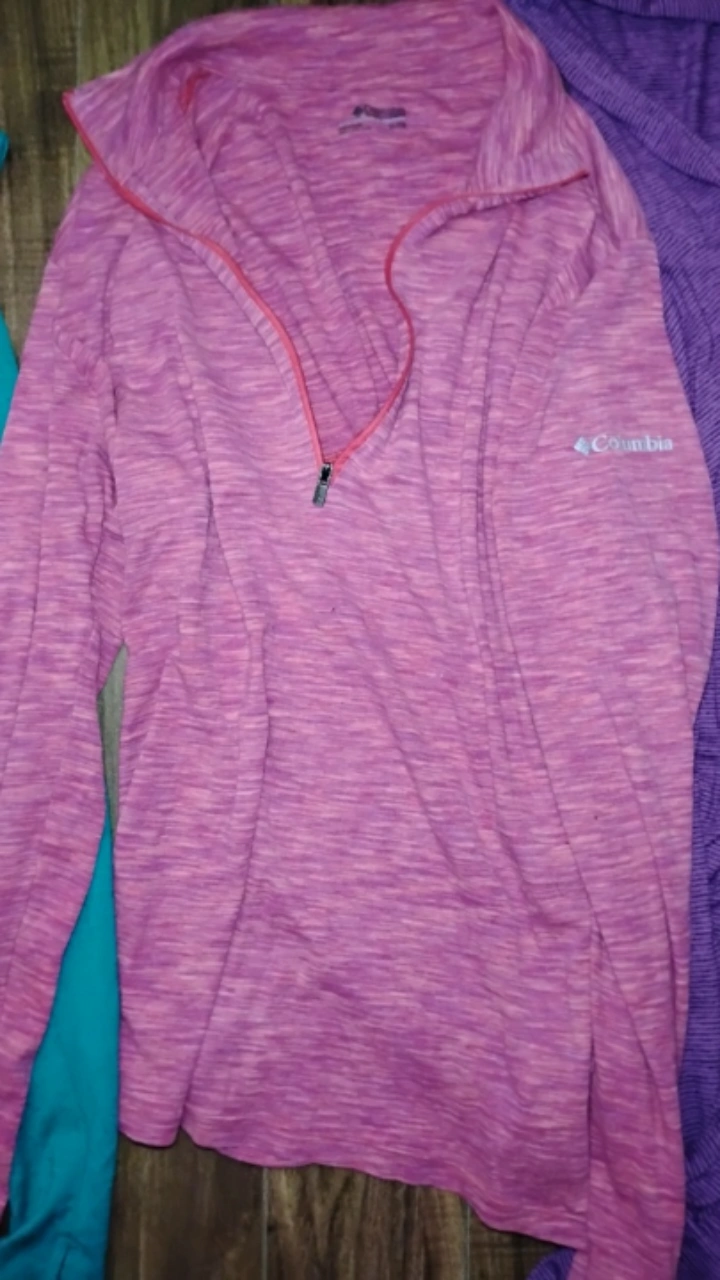 Bundle of three women's long sleeve athletic shirts. One pink COLUMBIA quarter-zip, one teal quarter-zip, and one SKETCHERS purple hooded long sleeve. Good for layering or workout apparel.