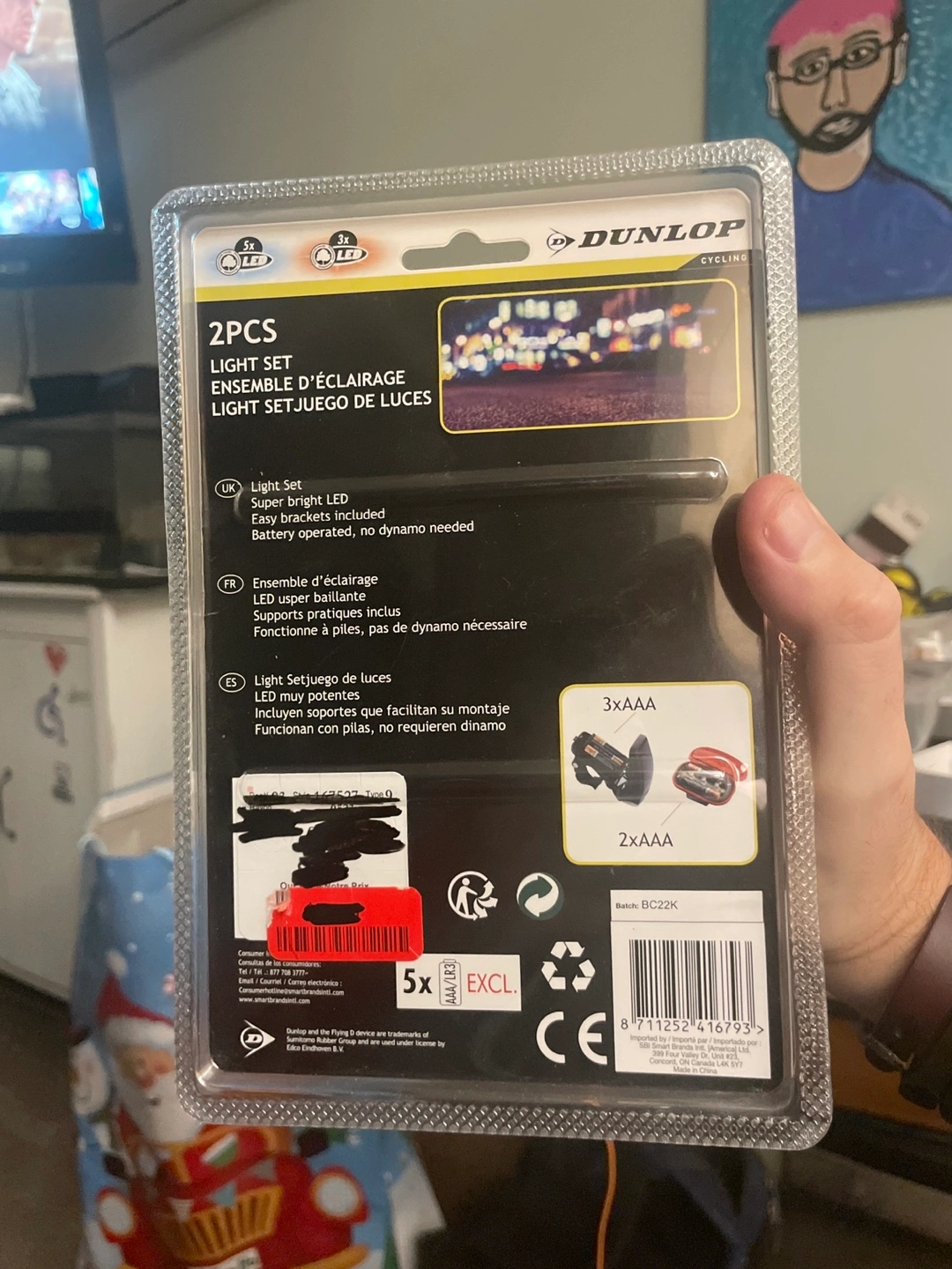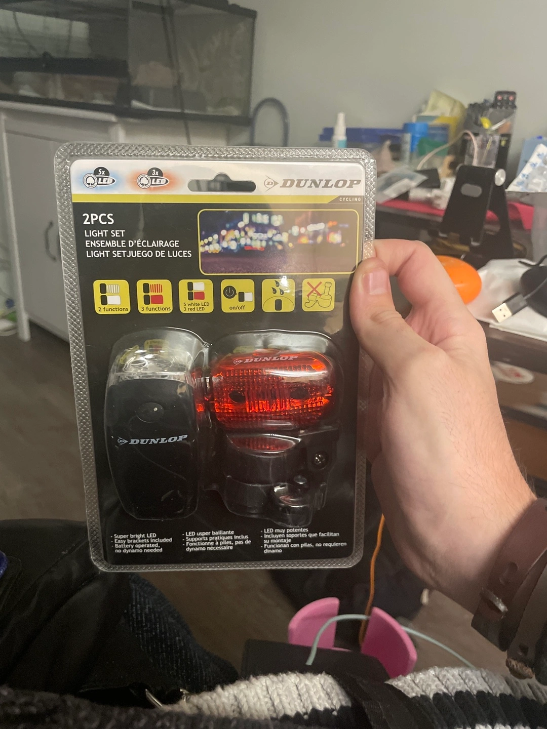 New in package. Bicycle light set. Includes two lights, one red and one white. Easy operation, battery powered; no dynamo needed. Super bright LED. Easy mounting brackets included.