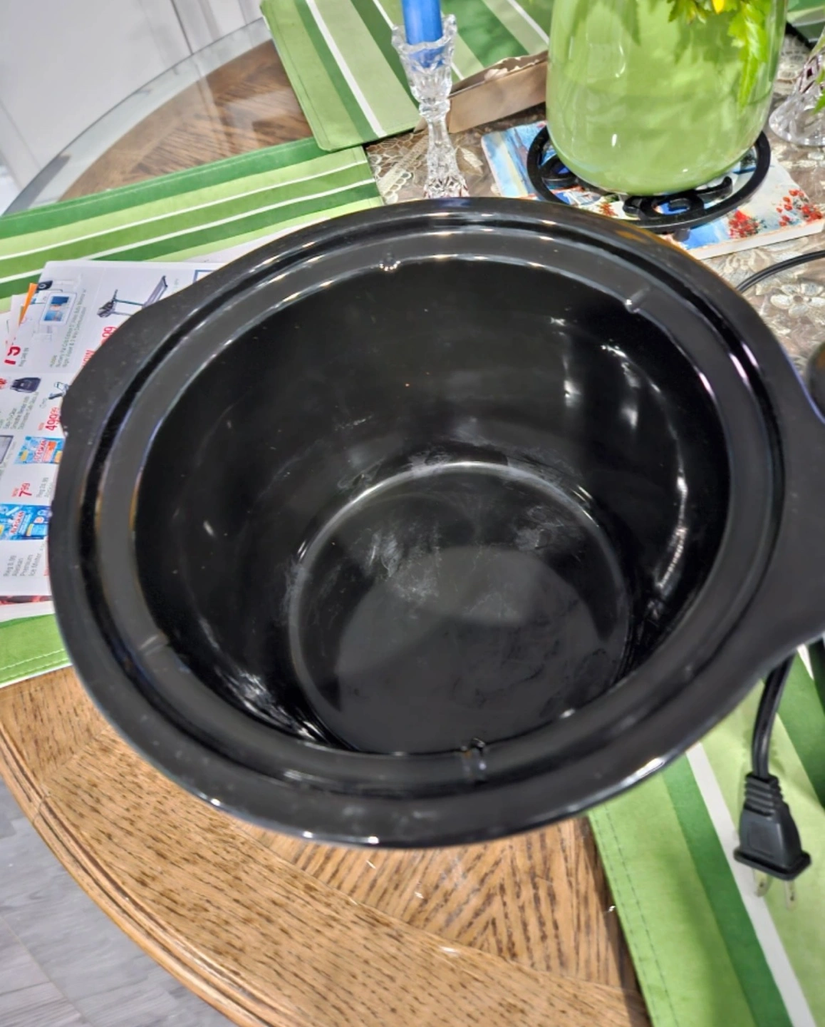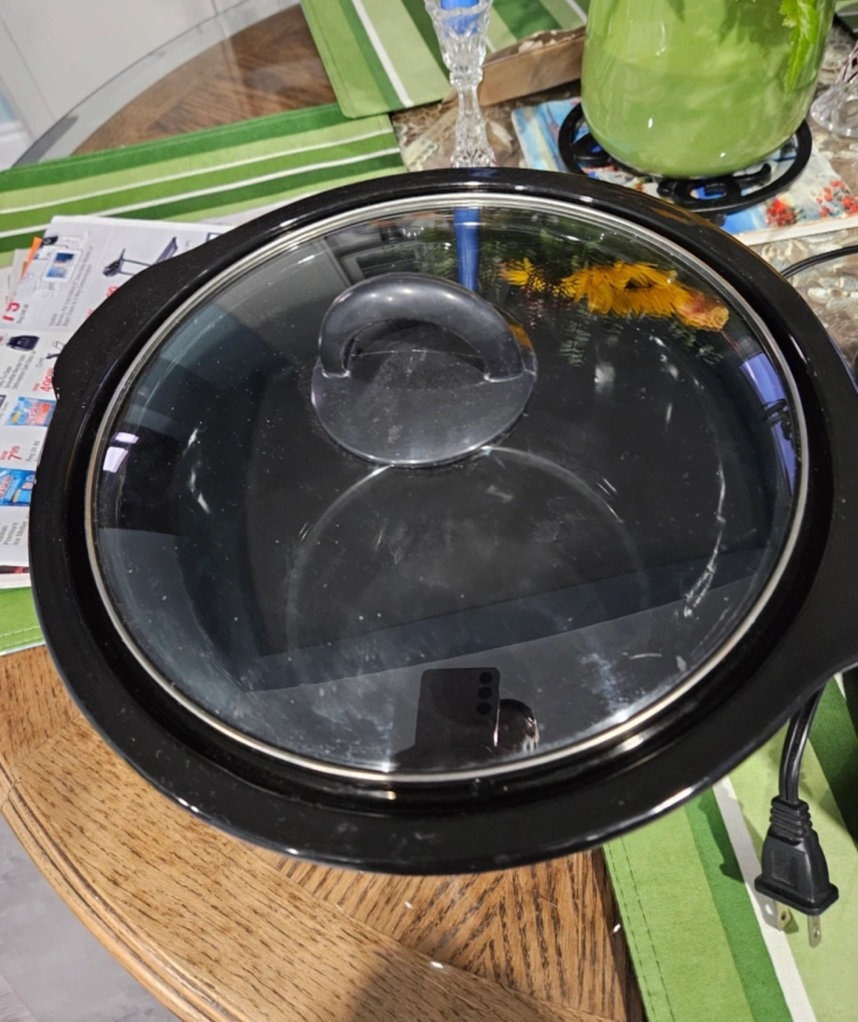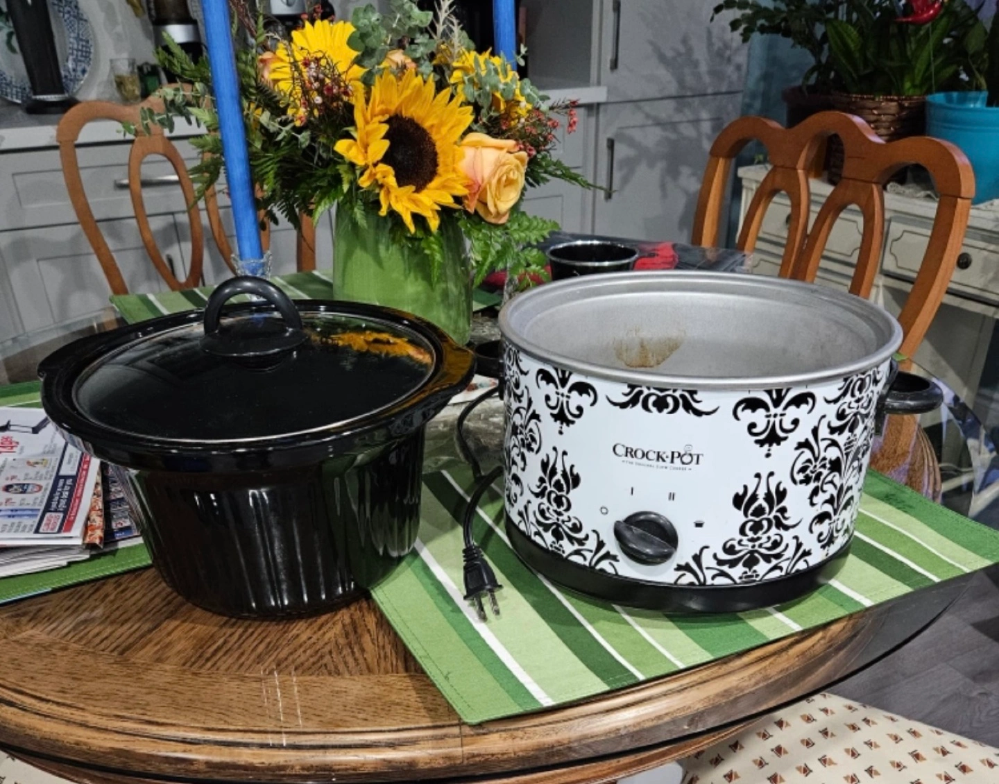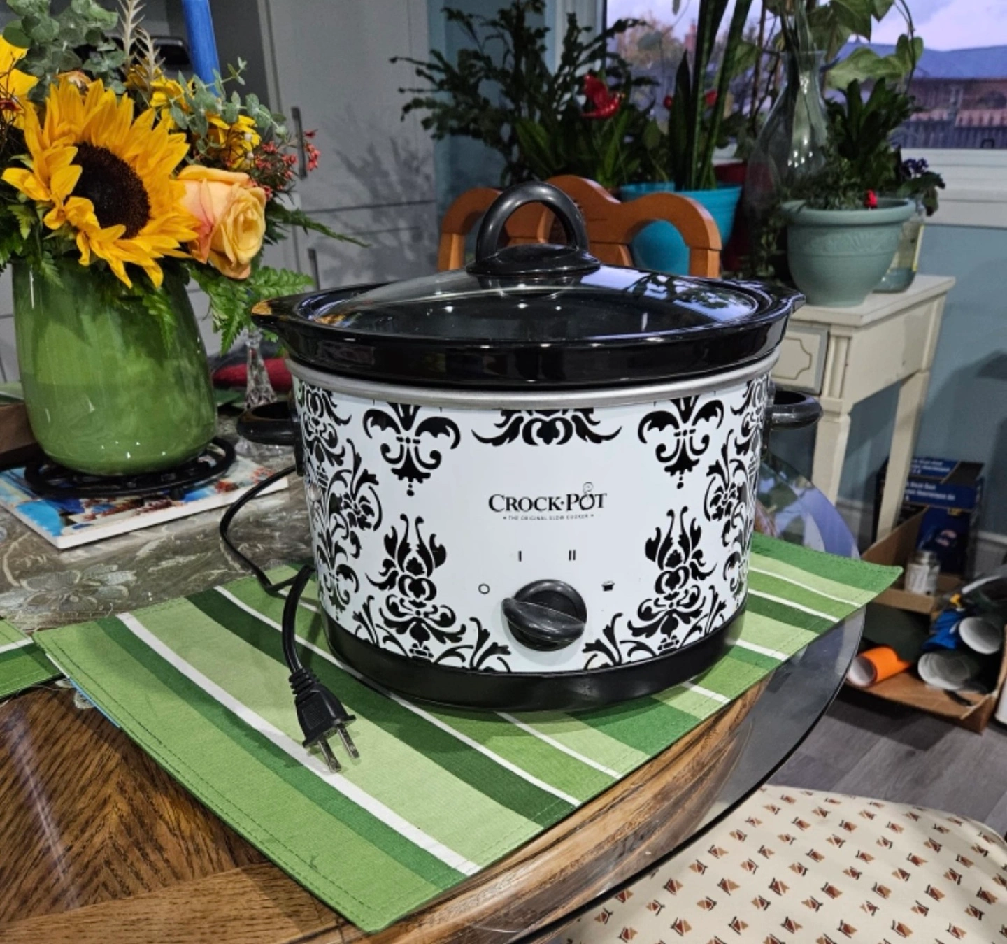 Crock-Pot Slow Cooker with black and white damask design Includes a glass lid. Used and well loved, bought a bigger one so letting it go.