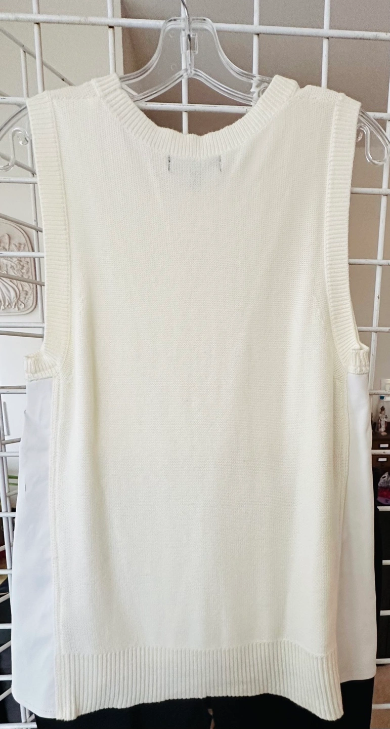 Cream-coloured sleeveless sweater vest. Features a round neckline and a slightly longer back hem. Made of a soft knit material. Size Medium/Medium. Side panels appear to be made of a different material.